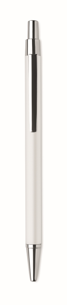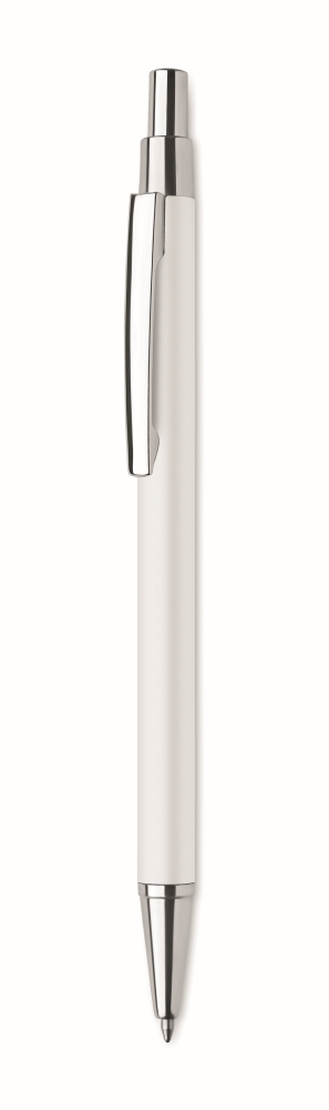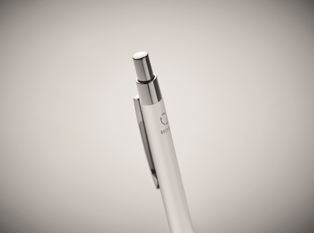 Push button ball pen in recycled aluminium. Blue ink. A classic office essential with a sustainable twist. The aluminium look gives this pen a more premium look and feel. Dimensions: O 0,8 x 14 cm
