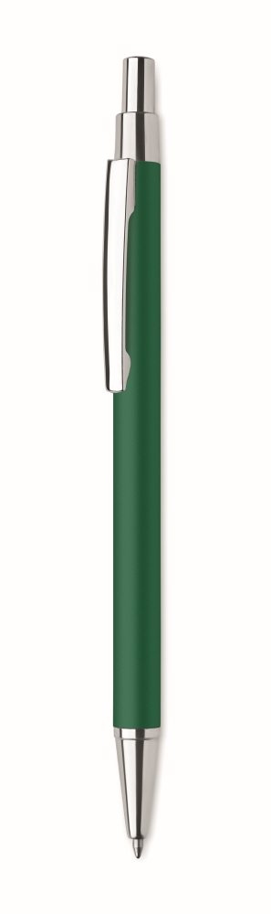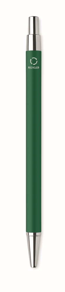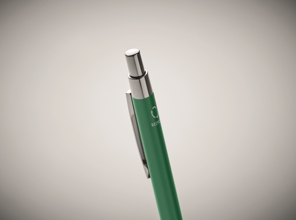 Push button ball pen in recycled aluminium. Blue ink. A classic office essential with a sustainable twist. The aluminium look gives this pen a more premium look and feel. Dimensions: O 0,8 x 14 cm