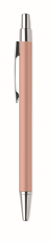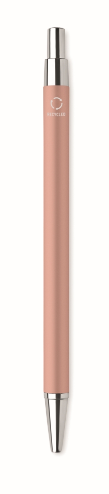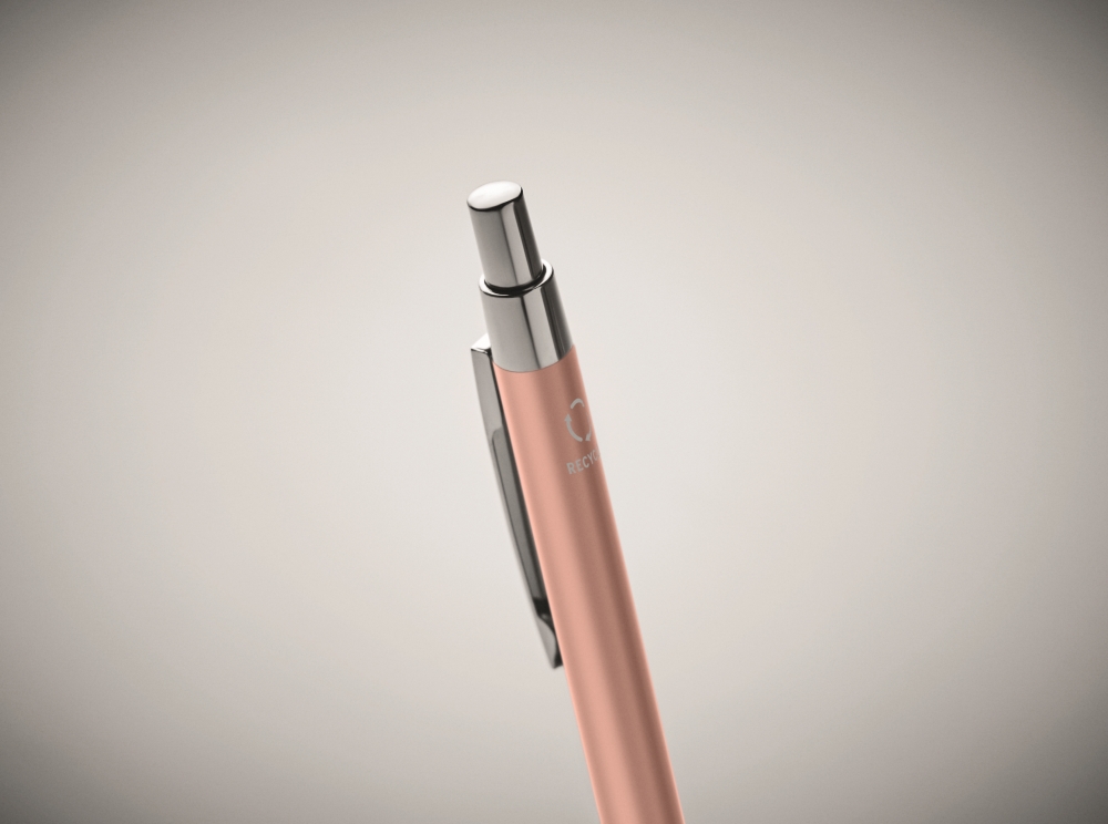 Push button ball pen in recycled aluminium. Blue ink. A classic office essential with a sustainable twist. The aluminium look gives this pen a more premium look and feel. Dimensions: O 0,8 x 14 cm