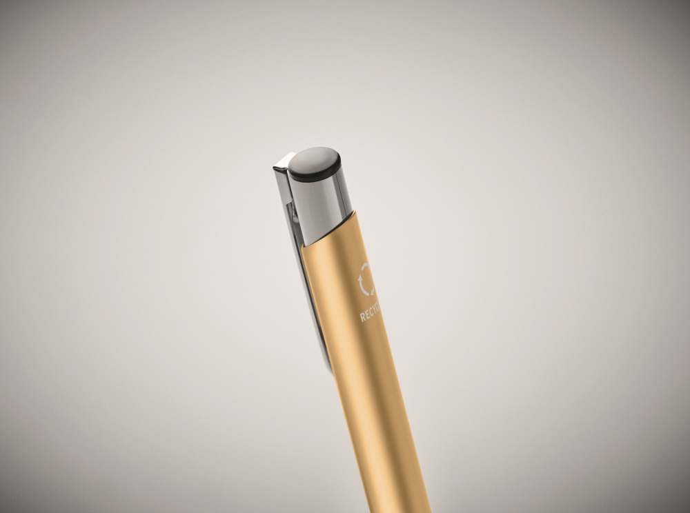 Push button ball pen in recycled aluminium. Blue ink. A classic and simple designed office essential. The aluminium barrel gives it a more premium look. Dimensions: O 1 x 13,7 cm