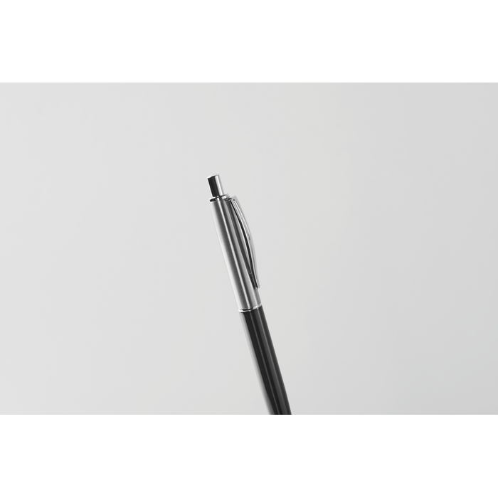 Push button ball pen in recycled stainless steel barrel. Blue ink. Presented in gift box.Dimensions: 17,5 x 2,8 x 2,2cm