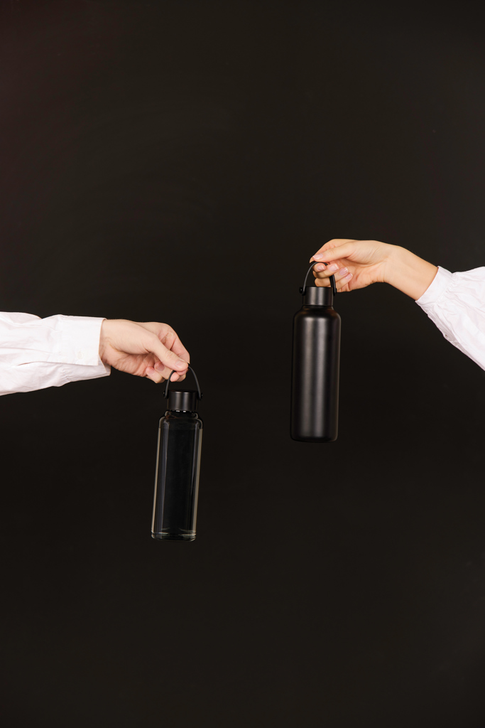 This double wall vacuum bottle, crafted from RCS certified recycled stainless steel, offers both performance and style. Designed with a minimalistic PU handle and black details that capture the essence of Baltimore series. The double walled insulation maintains drink temperatures cold for up to 12 hours, and hot for up to 6 hours, whether you need to stay cool with a chilled drink or enjoy a warm beverage on the go. Not dishwasher or microwave safe, only handwash. This product contains 80% RCS certified recycled stainless steel. Dimensions: 23.5 x o 7.4 cm