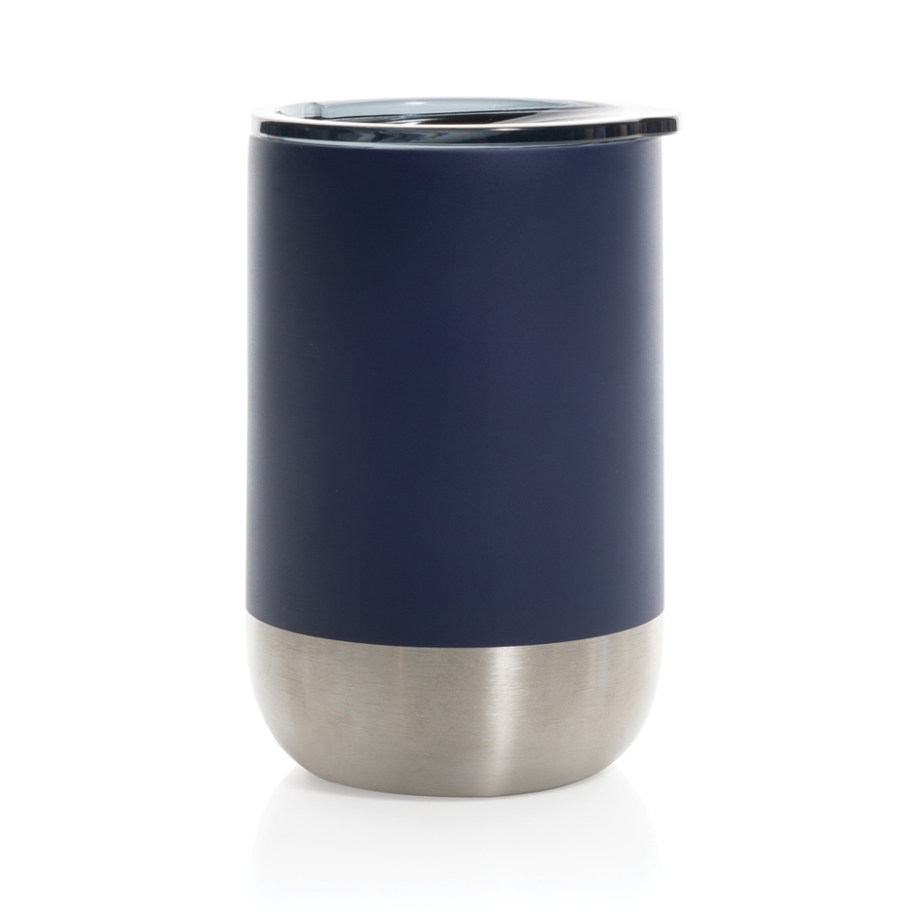 This beautiful tumbler features a recycled stainless steel construction with vacuum insulation to keep drinks warm for up to 3 hours or cold for up to 6 hours. Its trendy execution with stainless steel bottom accent makes it a true eye catcher. The lid wi