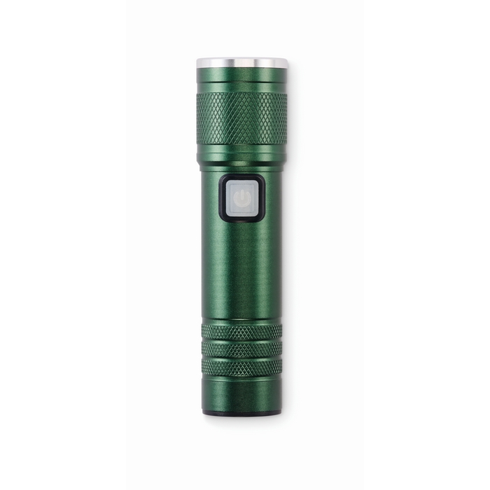 Rechargeable and expandable COB light torch in recycled aluminium. 100 lumen with 3 light settings and zoom function. Built-in 800 mAh rechargeable battery. Charging cable included.Dimensions: 2,9 x 2,9 x 11,2cm