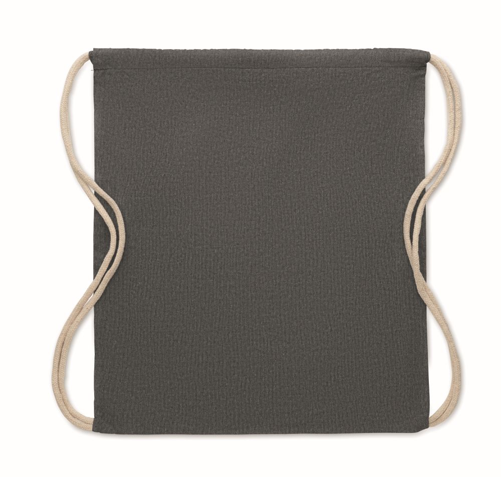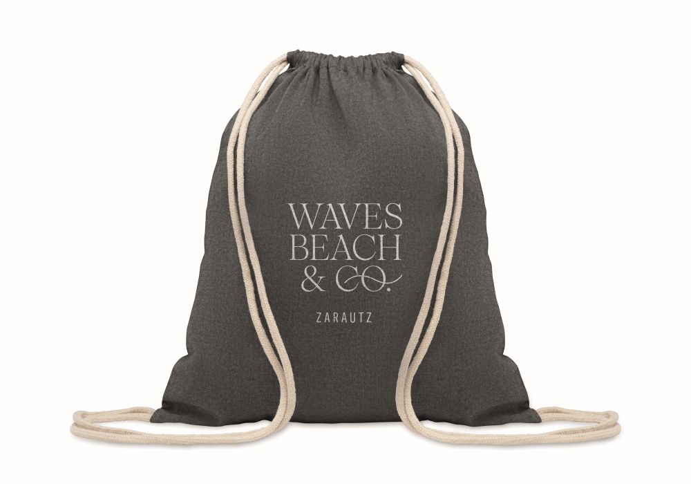 Drawstring bag in recycled cotton with extra short handles. 140 gr/m².