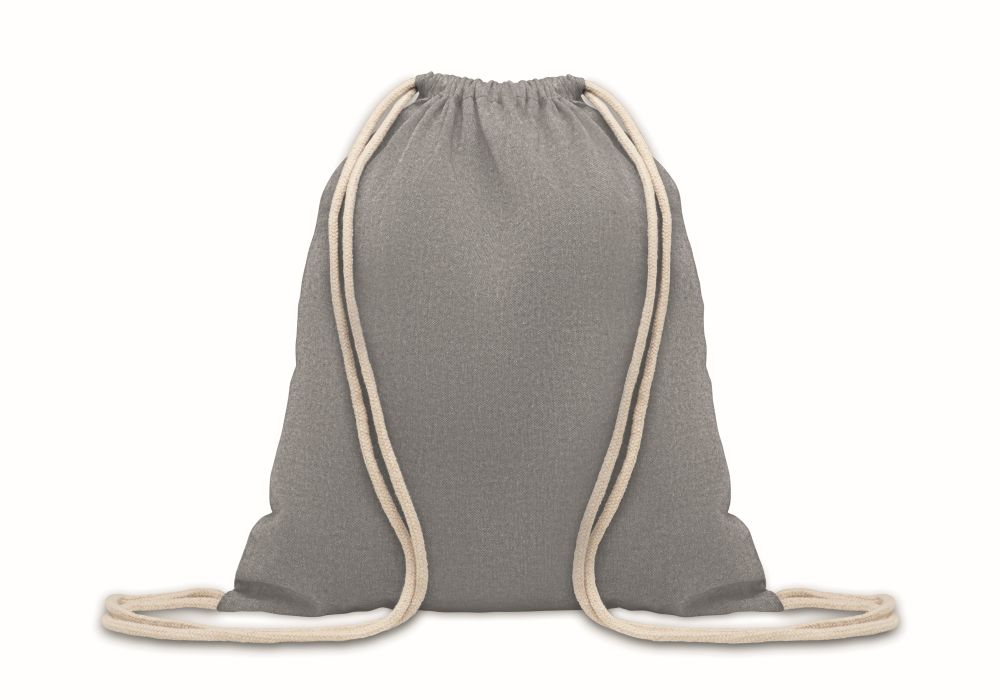 Drawstring bag in recycled cotton with extra short handles. 140 gr/m².