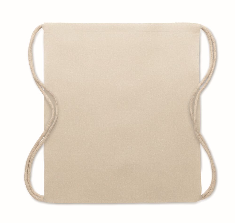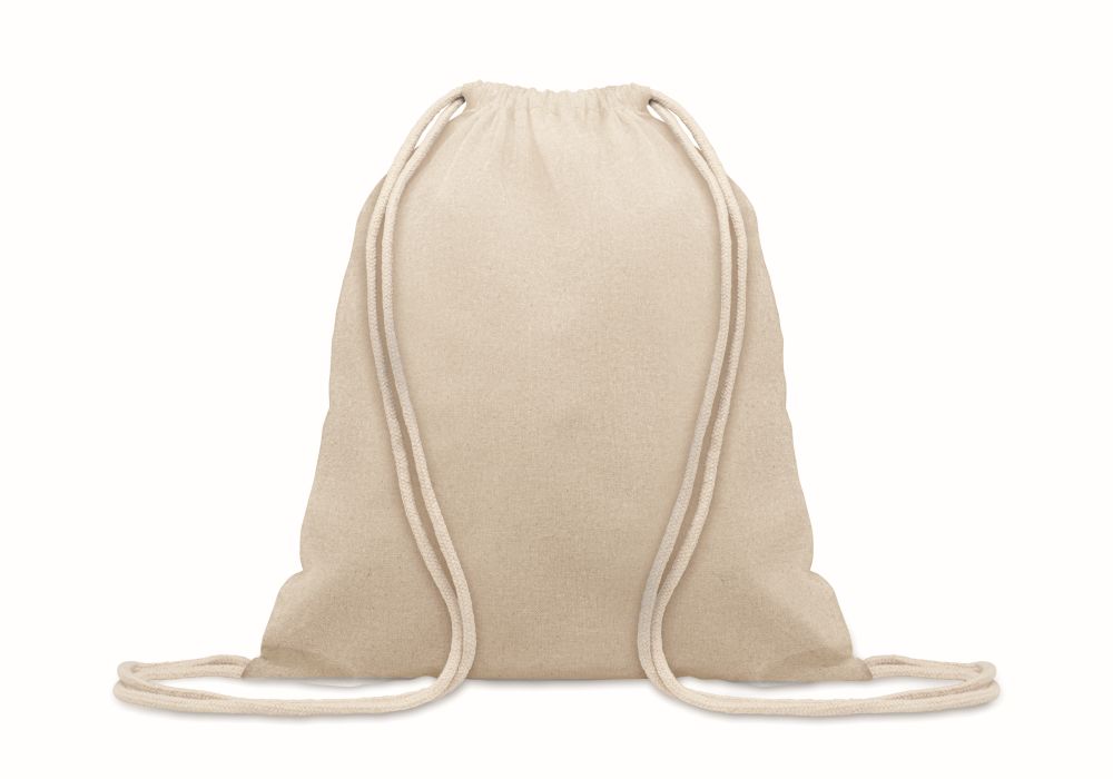 Drawstring bag in recycled cotton with extra short handles. 140 gr/m².