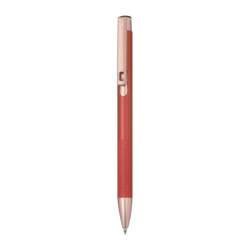 Ballpoint pen made of recycled aluminum with a matte finish and rose gold accents, equipped with a blue-writing large-capacity refill and a diamond-patterned grip zone. Your logo will be engraved to the right of the clip. Dimensions: 14,2 x 1 cm