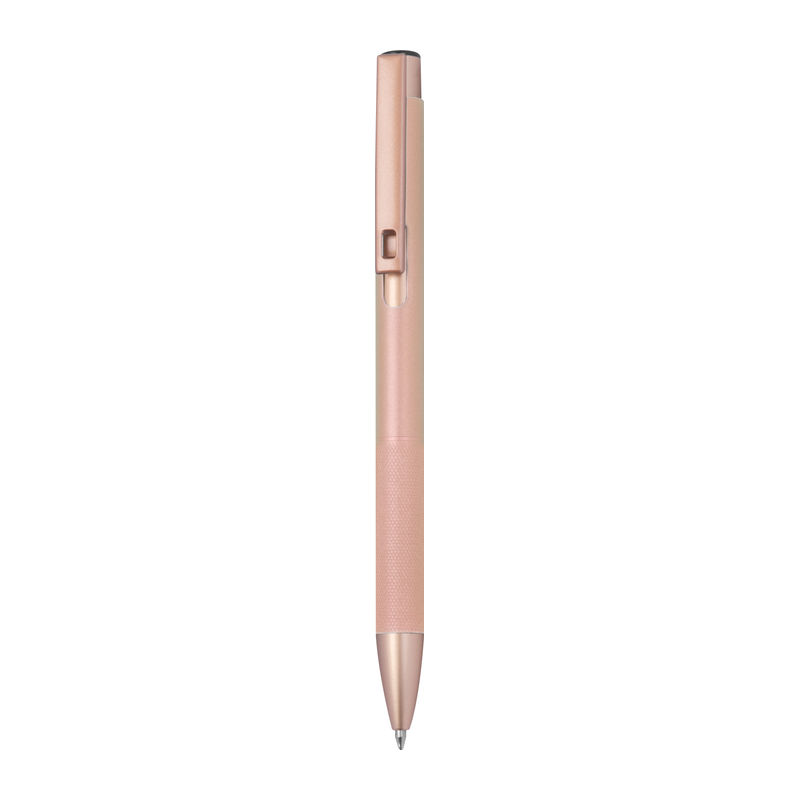 Ballpoint pen made of recycled aluminum with a matte finish and rose gold accents, equipped with a blue-writing large-capacity refill and a diamond-patterned grip zone. Your logo will be engraved to the right of the clip. Dimensions: 14,2 x 1 cm