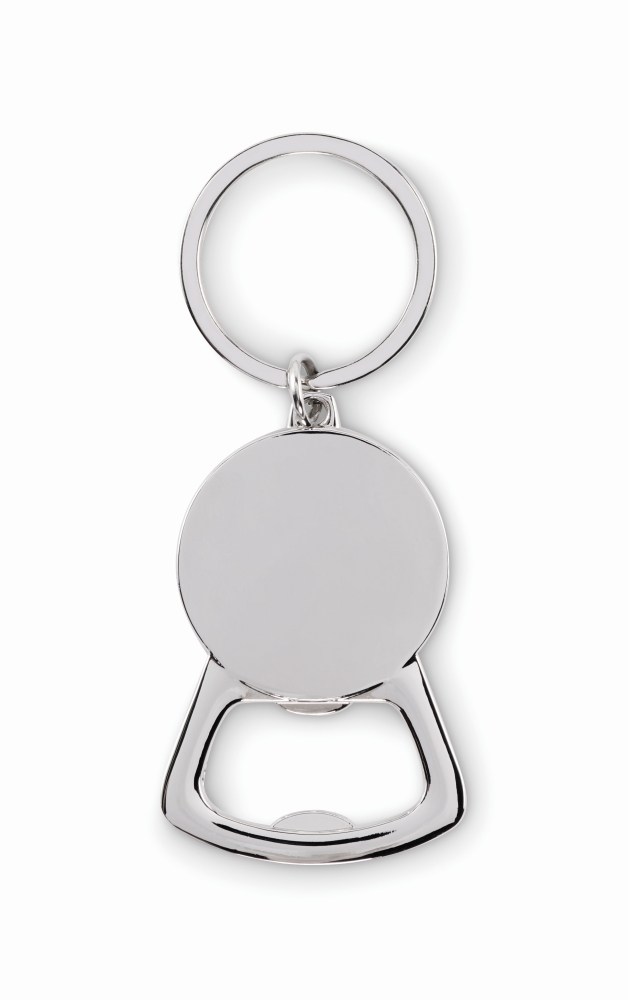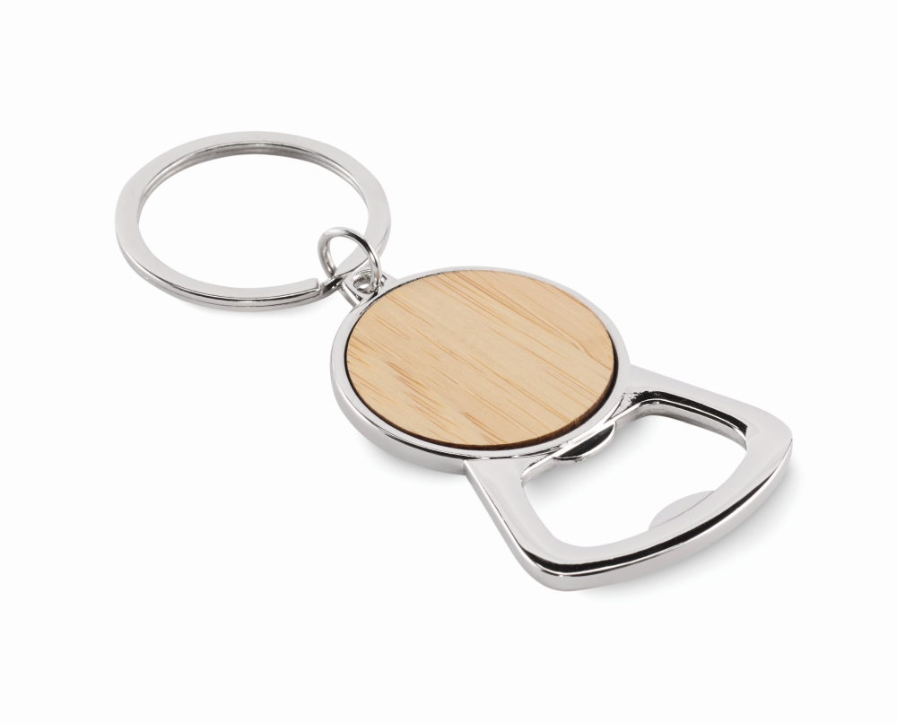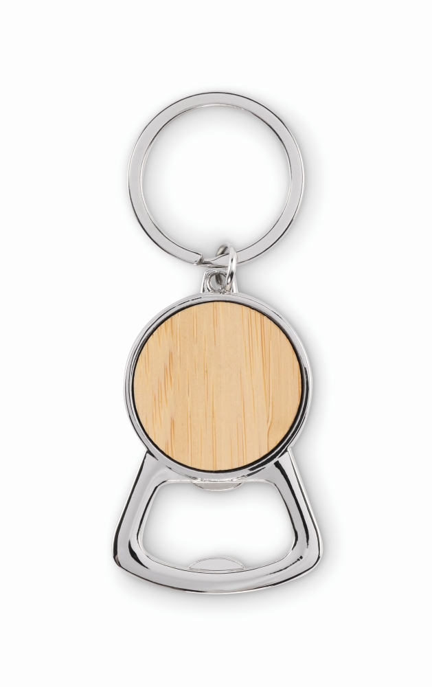 Metal bottle opener key ring with bamboo detail. Dimensions: 9 x 3,3 cm
