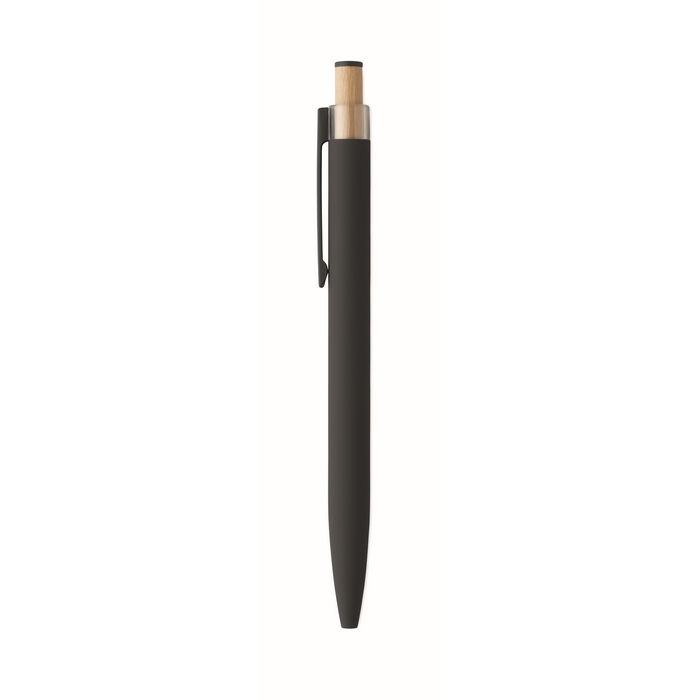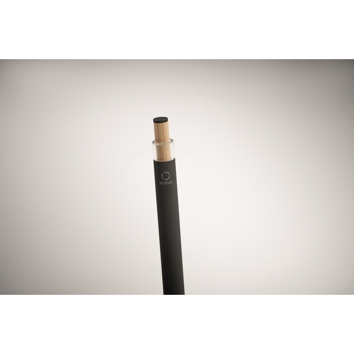 Recycled aluminium push ball pen with bamboo button with matching colour detail and matching metal clip. Blue ink.Dimensions: O1 x 14cm