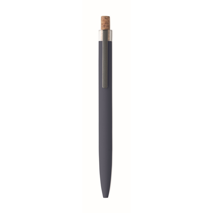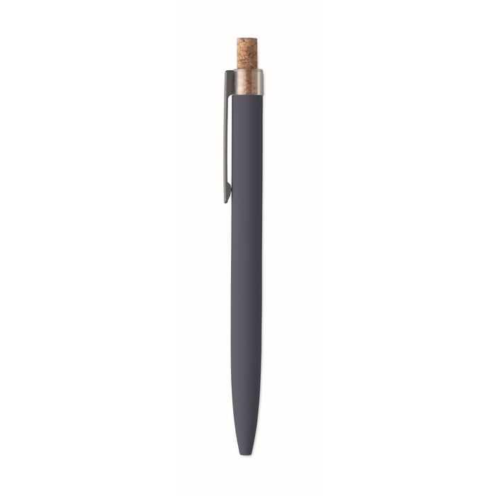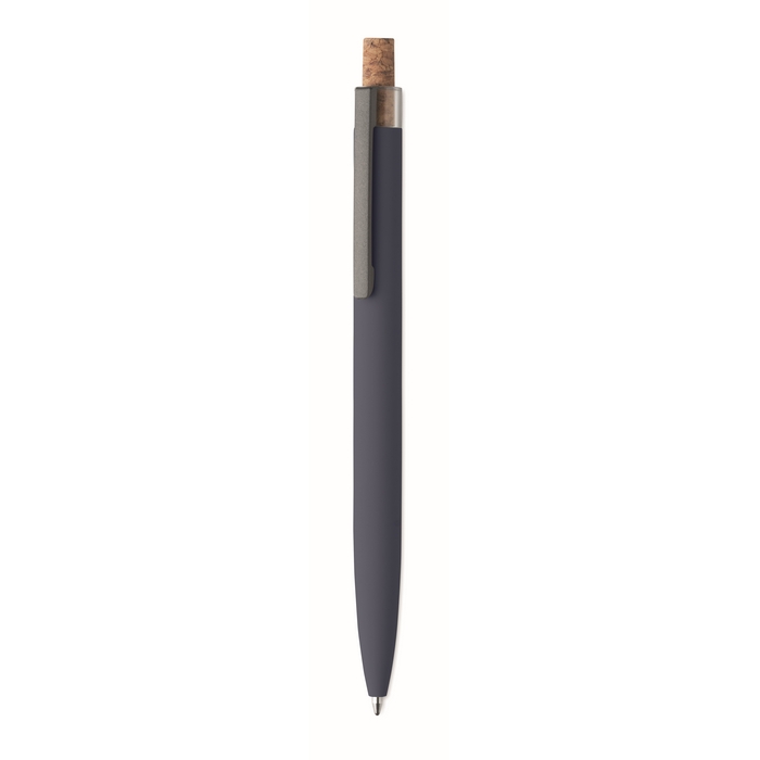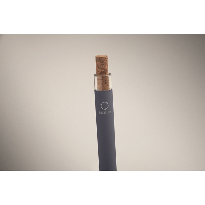 Push ball pen in recycled aluminium with cork detail button and metal clip. Blue ink.Dimensions: O1 x 14cm