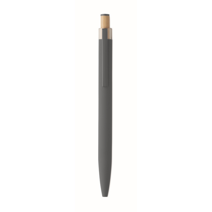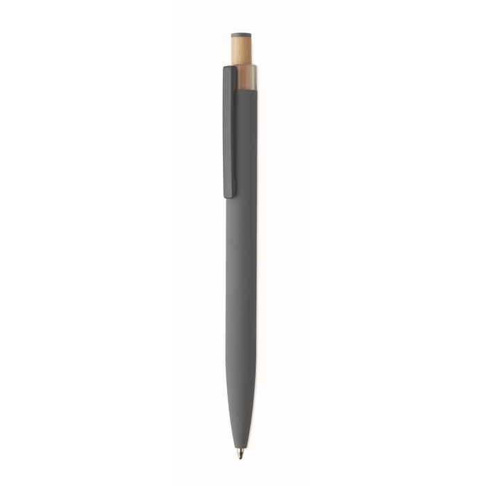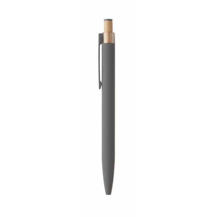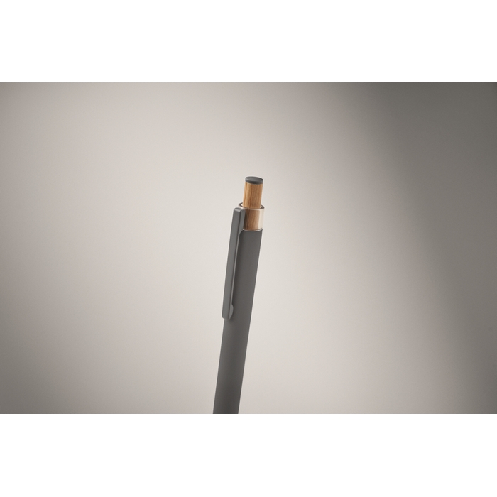 Recycled aluminium push ball pen with bamboo button with matching colour detail and matching metal clip. Blue ink.Dimensions: O1 x 14cm