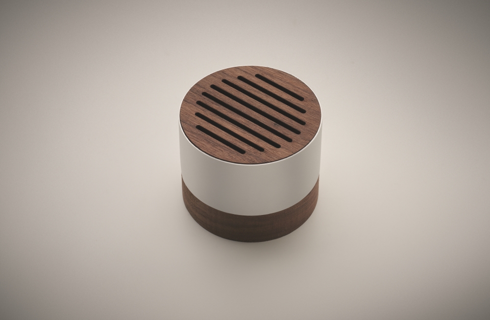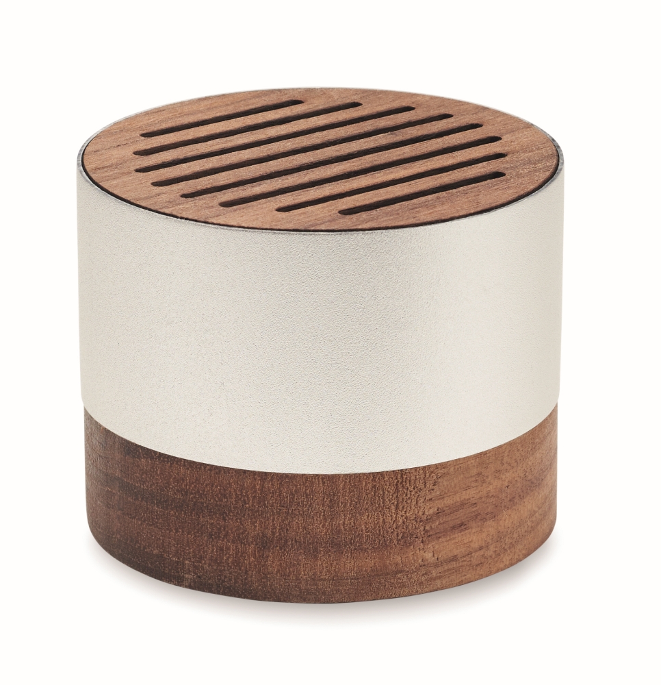 5.3 wireless speaker in recycled aluminium casing with walnut base and top detail. 1 Rechargeable Li-ION 300 mAh battery included. Output data: 3W, 3 Ohm and 5V. Playing time approx. 3h. Dimensions: O 6,9 x 5 cm