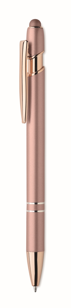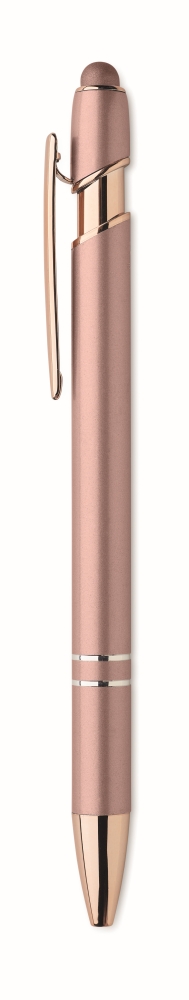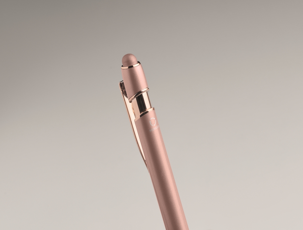 Recycled aluminium stylus push ball pen with rose gold details. Blue ink. Dimensions: O 1 x 14,3 cm