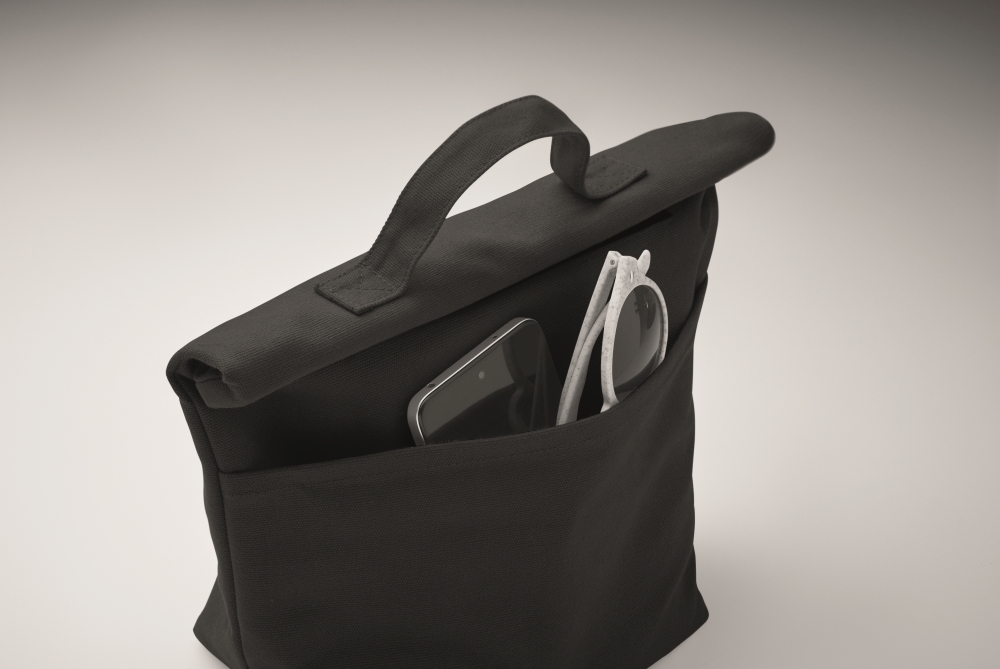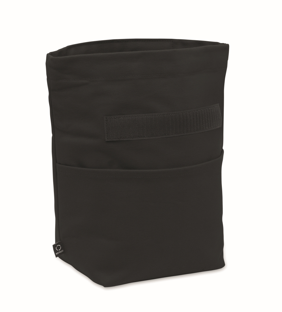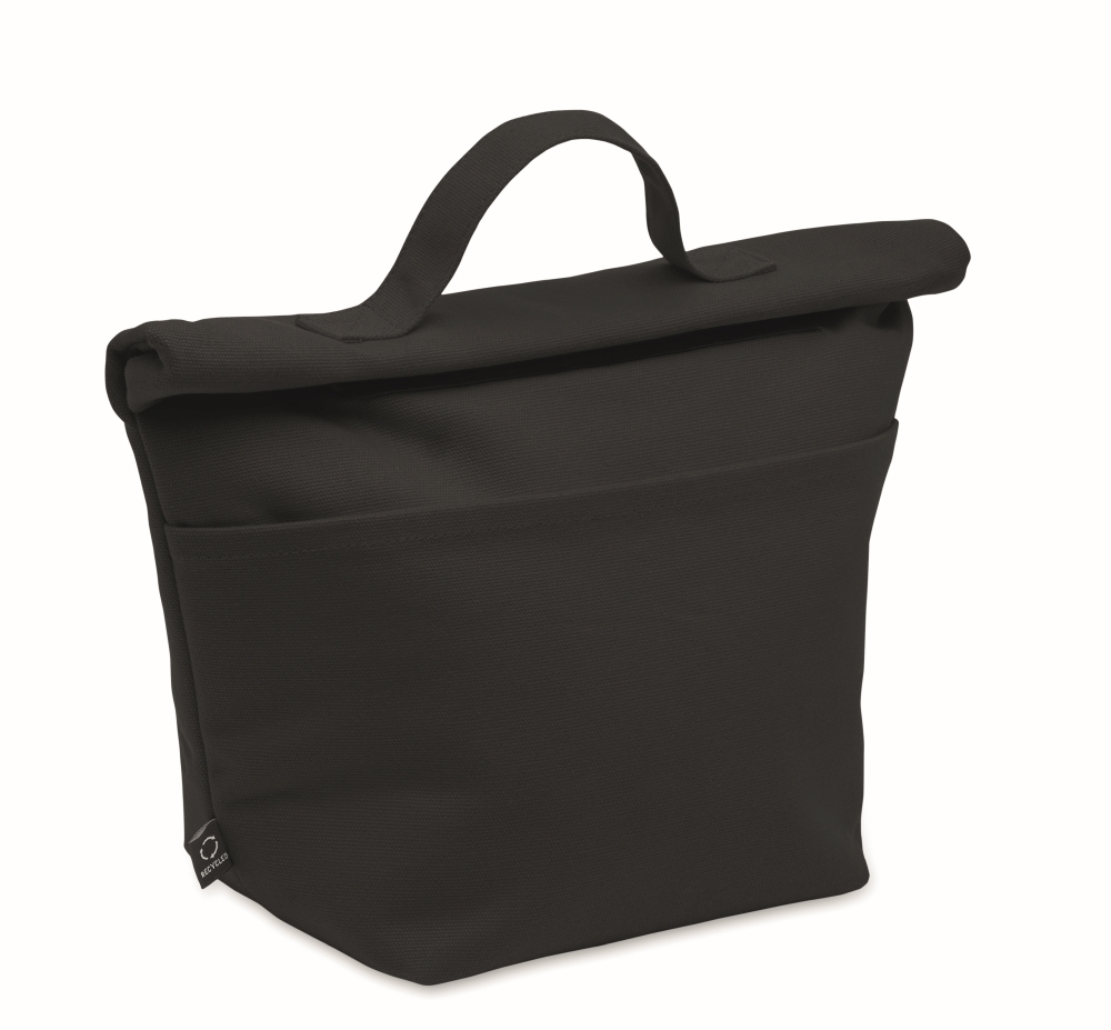 Recycled cotton (70% recycled cotton, 30% recycled polyester) insulated lunch cooler bag with rolltop hook and loop closure. Insulation: 3mm PE foam with 12C PEVA. Dimensions: 18 x 14 x 30 cm