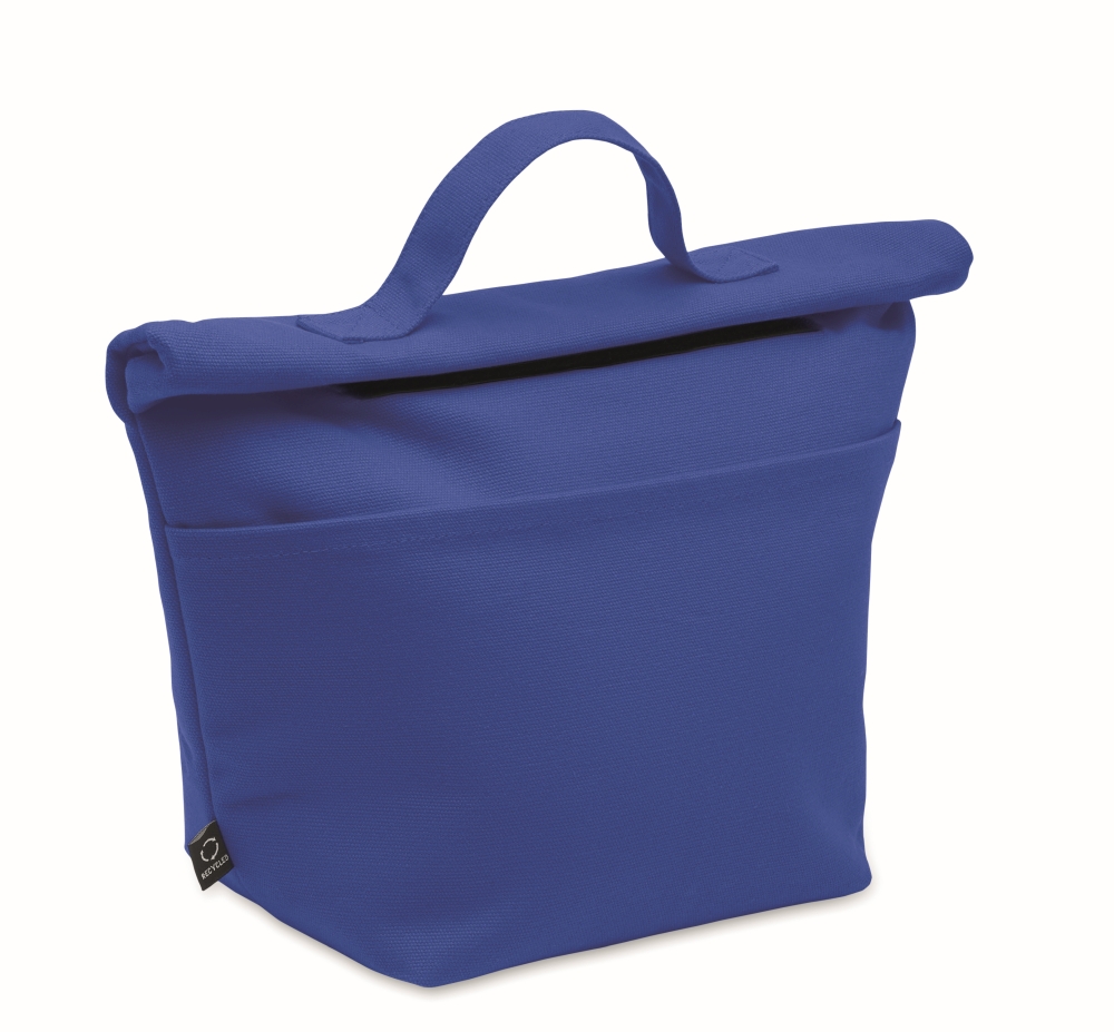 Recycled cotton (70% recycled cotton, 30% recycled polyester) insulated lunch cooler bag with rolltop hook and loop closure. Insulation: 3mm PE foam with 12C PEVA. Dimensions: 18 x 14 x 30 cm