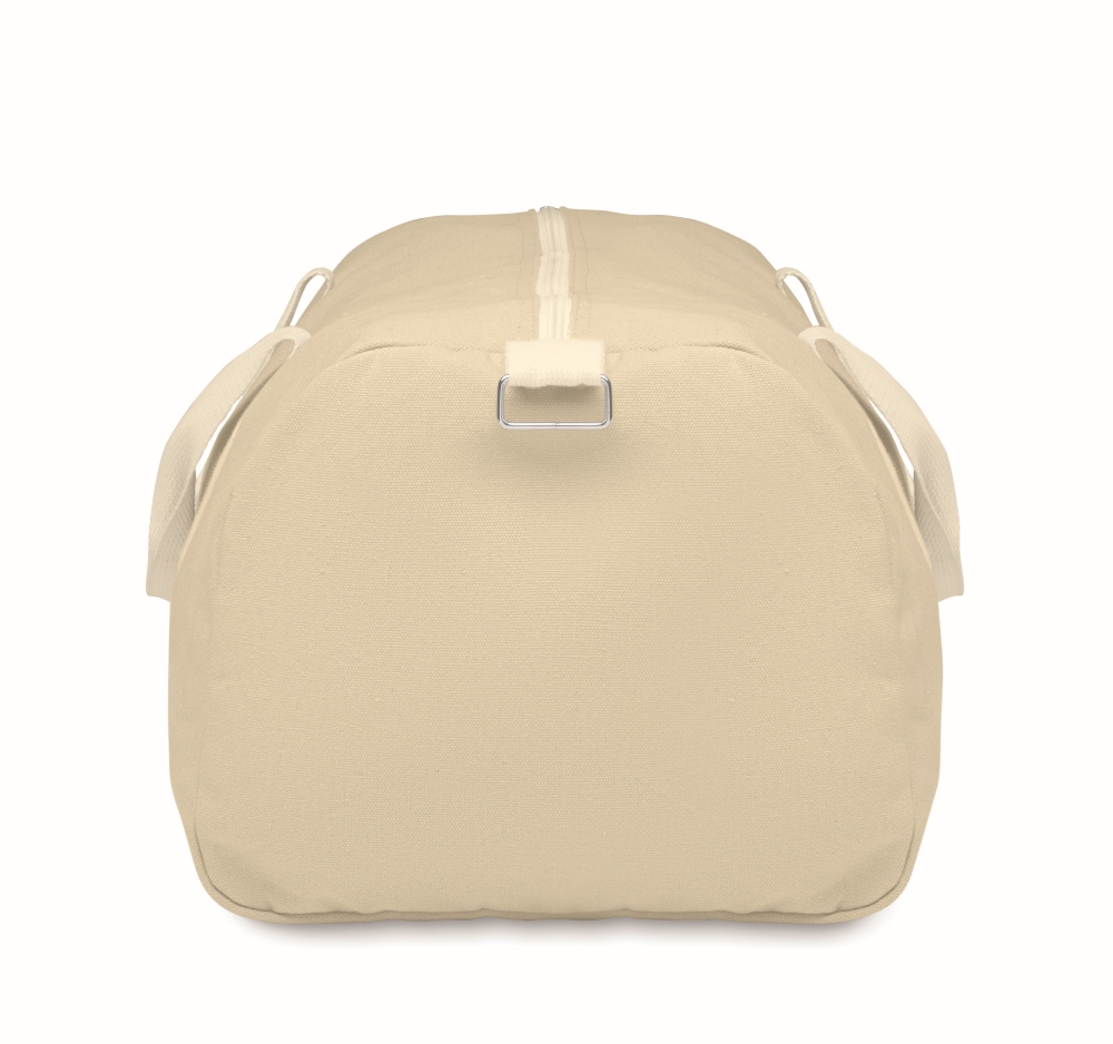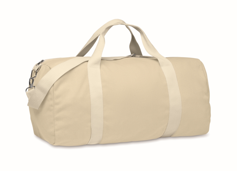 Duffle bag in recycled fabrics (60% recycled cotton, 40% recycled polyester) in 320 gr/m2 with handle natural cotton webbing and an adjustable and detachable shoulder strap. Dimensions: 49 x 26 x 24 cm