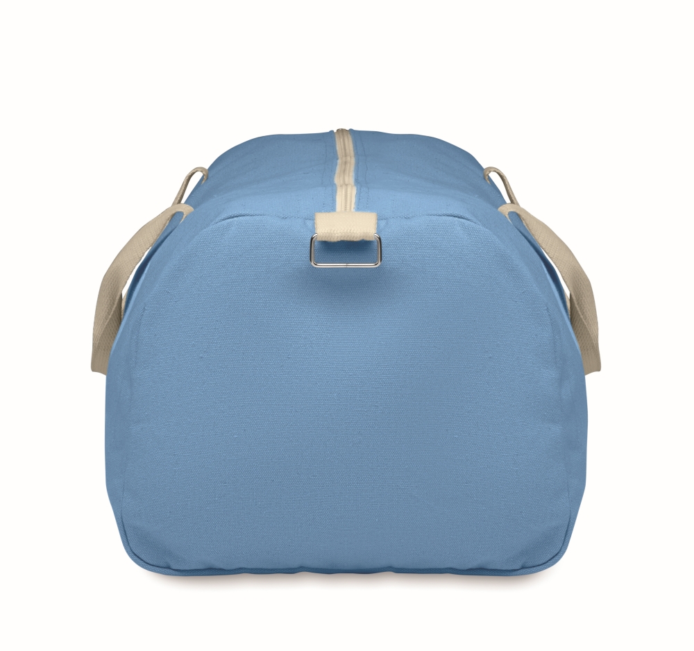 Duffle bag in recycled fabrics (60% recycled cotton, 40% recycled polyester) in 320 gr/m2 with handle natural cotton webbing and an adjustable and detachable shoulder strap. Dimensions: 49 x 26 x 24 cm