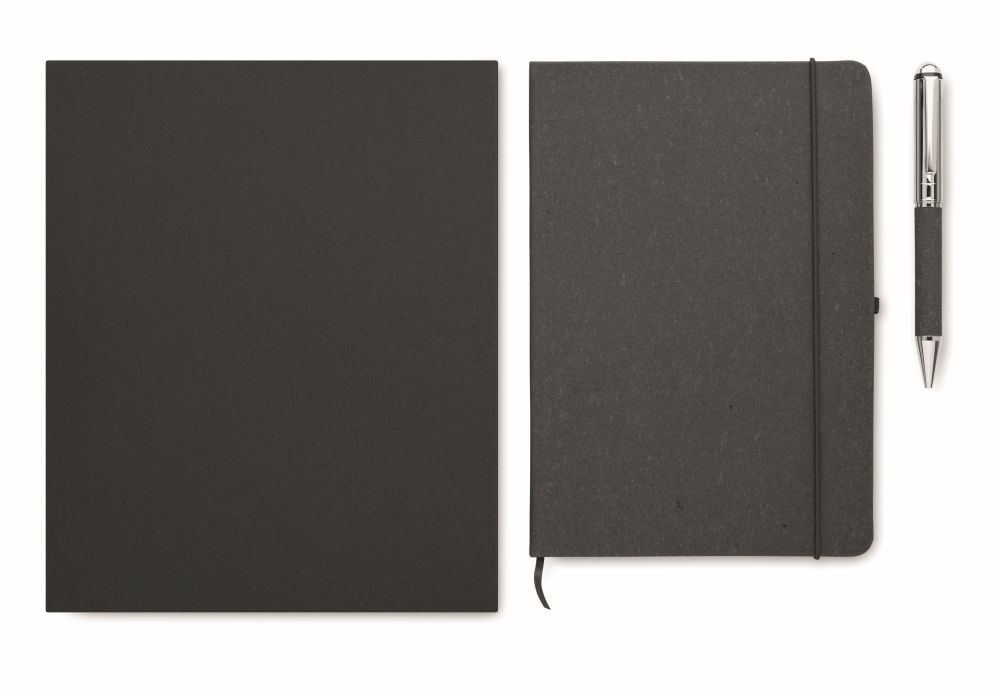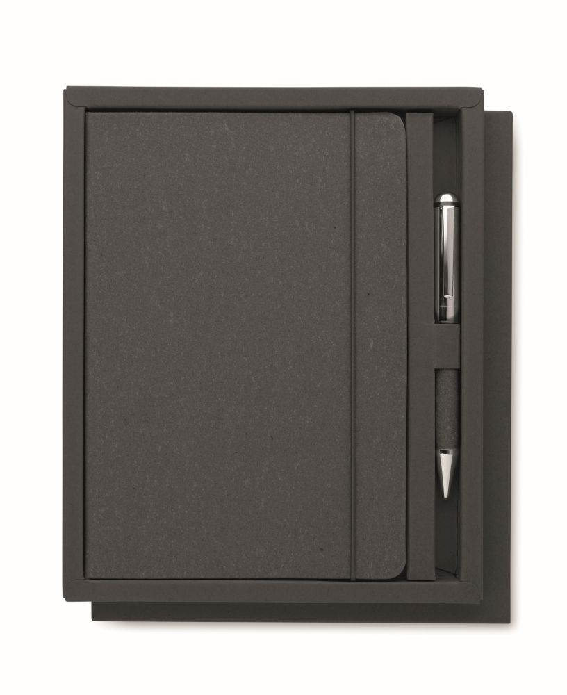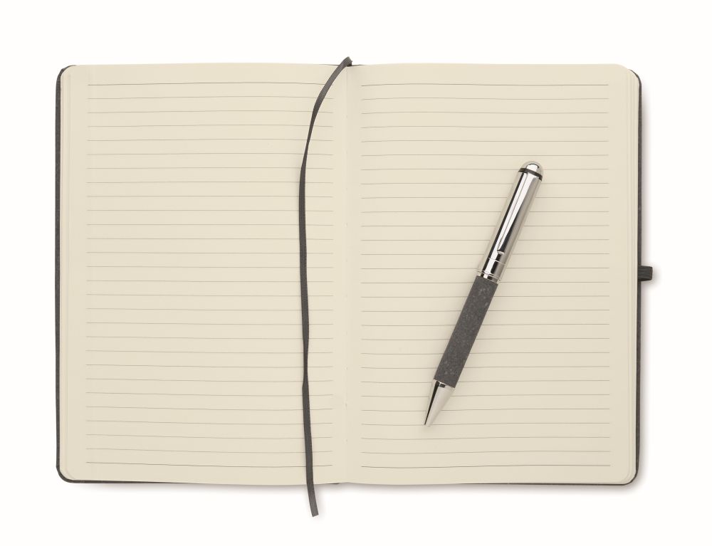 Gift set. Recycled leather (75%) A5 notebook with hard cover. Casebound. 160 lined pages (80 sheets). Matching elastic closure strap, ribbon page-marker and pen holder. Matching twist metal pen. Blue ink. Presented in a craft paper box.