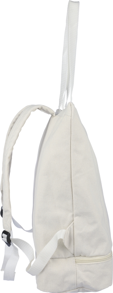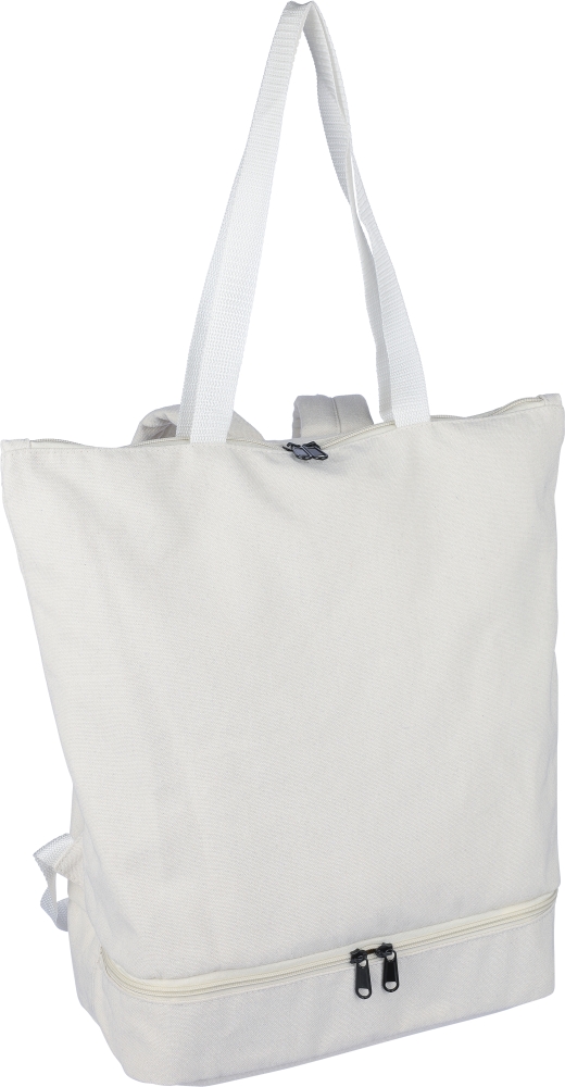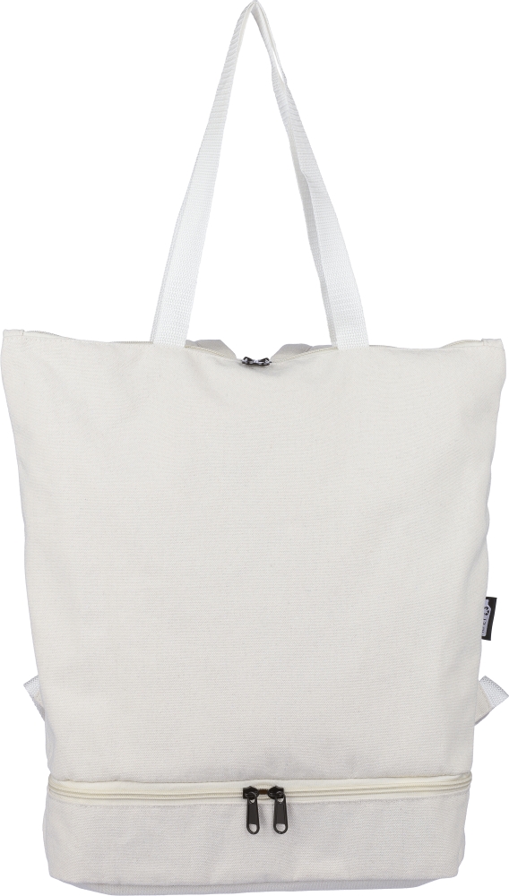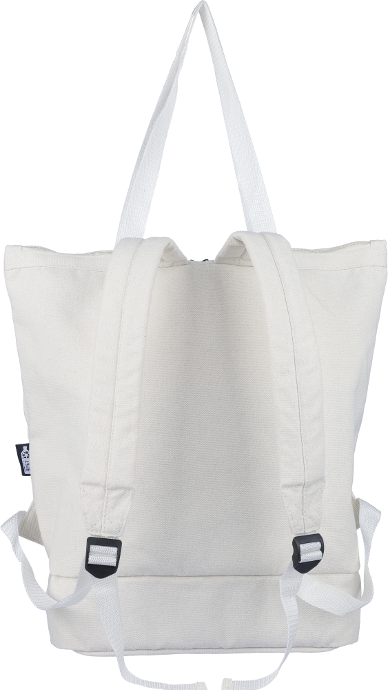 Recycled polycotton (330 gsm) tote backpack with a 210D polyester lining. Features a large zippered compartment at the top, a zippered compartment at the bottom, a laptop compartment for 15-inch laptop, two inner compartments, and one zippered outer compartments. The design includes long carrying handles and padded adjustable straps. Capacity: 30L. Carrying capacity: 15 kg. Includes a label. Dimensions: 44 x 16 x 44 cm