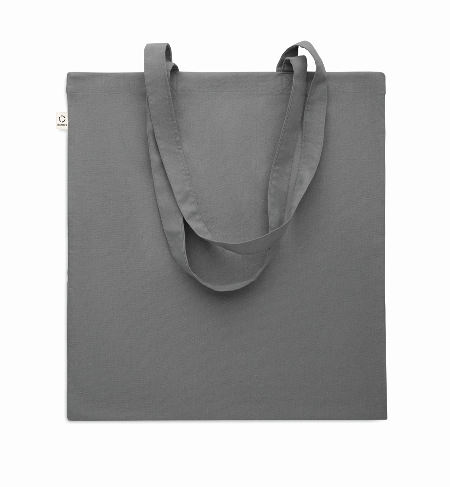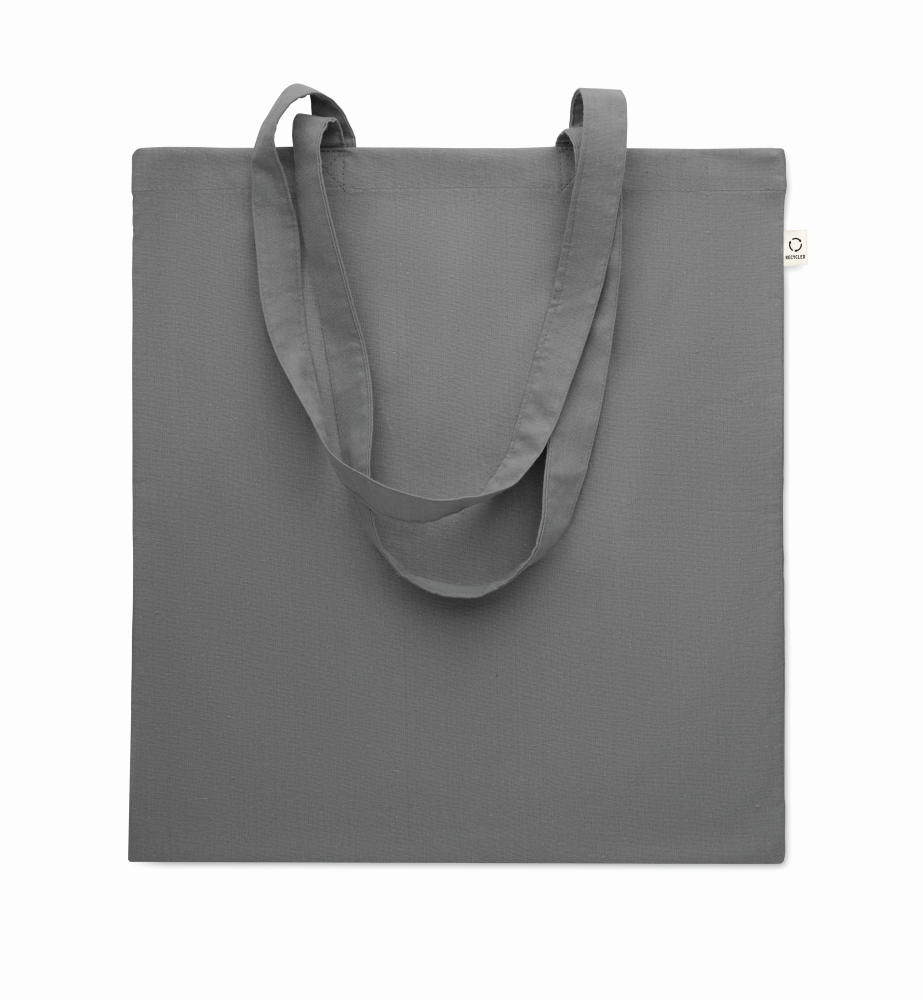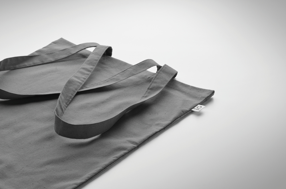 Recycled pre-consumer cotton shopping bag (70% recycled cotton and 30% RPET) with long handles. 140 gr/m2. Dimensions: 38 x 42 cm