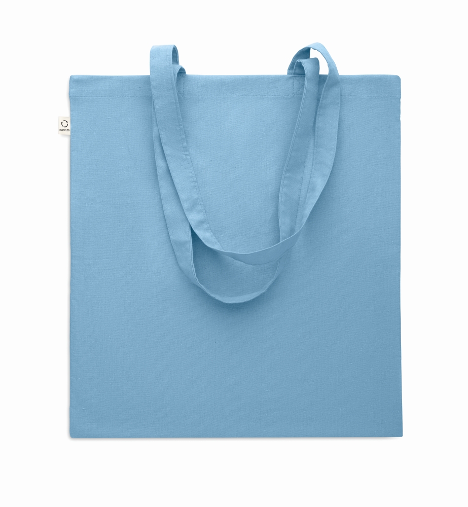 Recycled pre-consumer cotton shopping bag (70% recycled cotton and 30% RPET) with long handles. 140 gr/m2. Dimensions: 38 x 42 cm