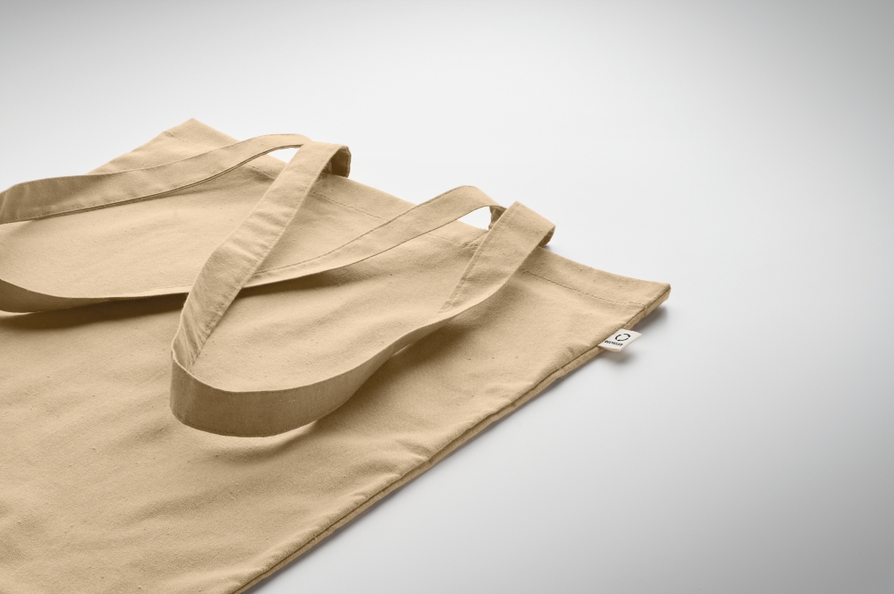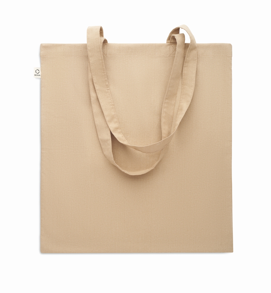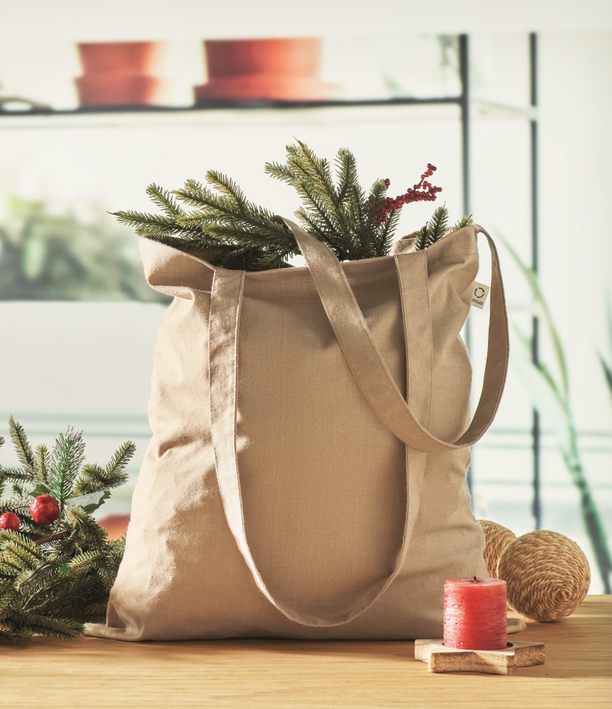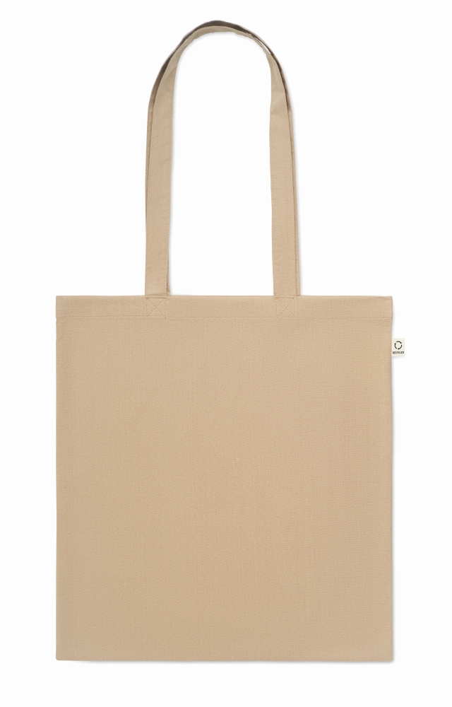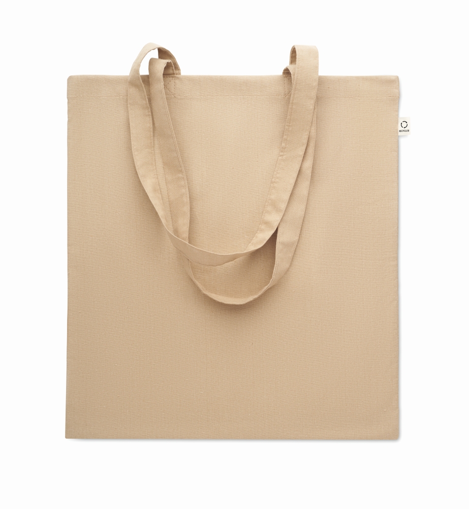 Recycled pre-consumer cotton shopping bag (70% recycled cotton and 30% RPET) with long handles. 140 gr/m2. Dimensions: 38 x 42 cm