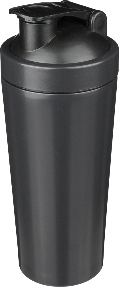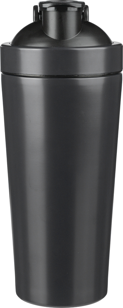 Recycled stainless steel sport drinking bottle (750 ml) with an interior made of stainless steel 304 and an exterior of stainless steel 201. Features a PP screw lid and includes a metal shaker ball for mixing. Laser-engraved recycled logo on the front. Individually packaged in a kraft paper box. Dimensions: 8 x 23 cm