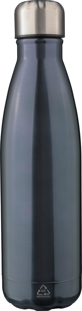 Recycled stainless steel double-walled flask (500 ml) with screw cap. The interior is made of stainless steel 304, and the exterior is stainless steel 201. Recycled logo engraved on the flask. Individually packaged in a brown cardboard box. Dimensions: 7 x 25,7 cm