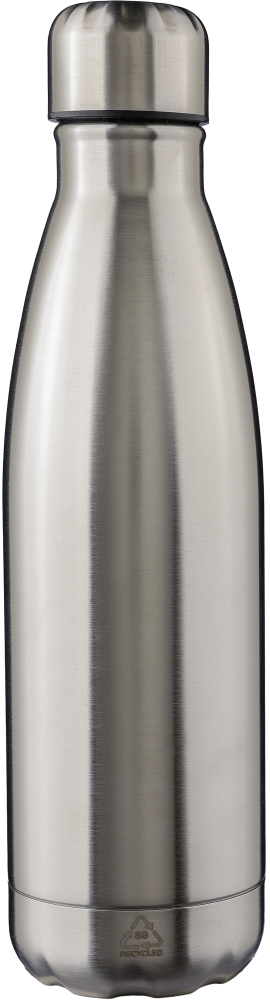 Recycled stainless steel double-walled flask (500 ml) with screw cap. The interior is made of stainless steel 304, and the exterior is stainless steel 201. Recycled logo engraved on the flask. Individually packaged in a brown cardboard box. Dimensions: 7 x 25,7 cm