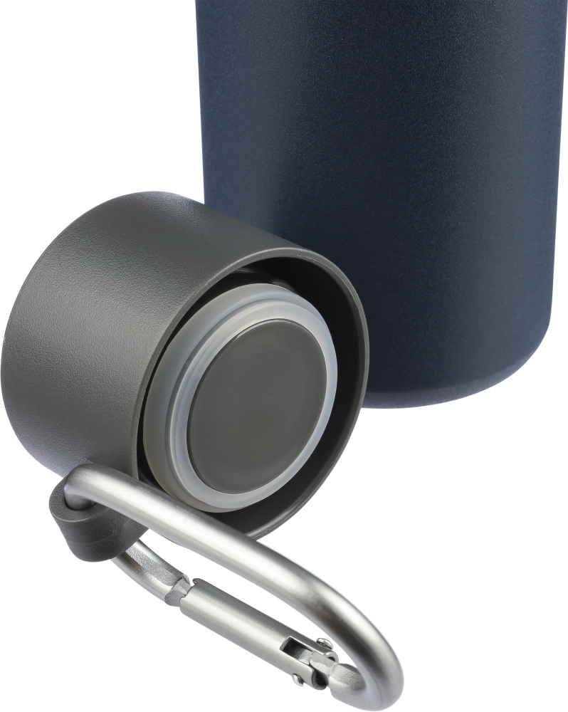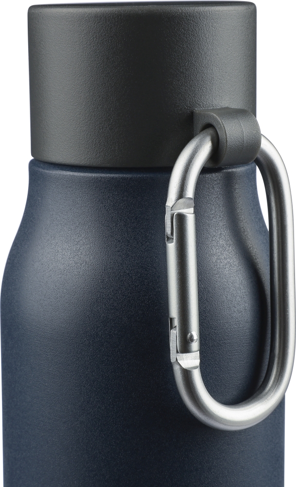 Recycled stainless steel drinking bottle (600 ml). The interior is made of stainless steel 304, and the exterior is stainless steel 201. Features a leak-proof black PP lid with an aluminum carabiner hook and carrying loop. Carabiner hook is not suitable for climbing. Keeps beverages hot for 6 hours or cold for 9 hours. Includes an engraved recycled logo on the front. Individually packaged in a brown cardboard box. Dimensions: 6,5 x 6,5 x 25 cm