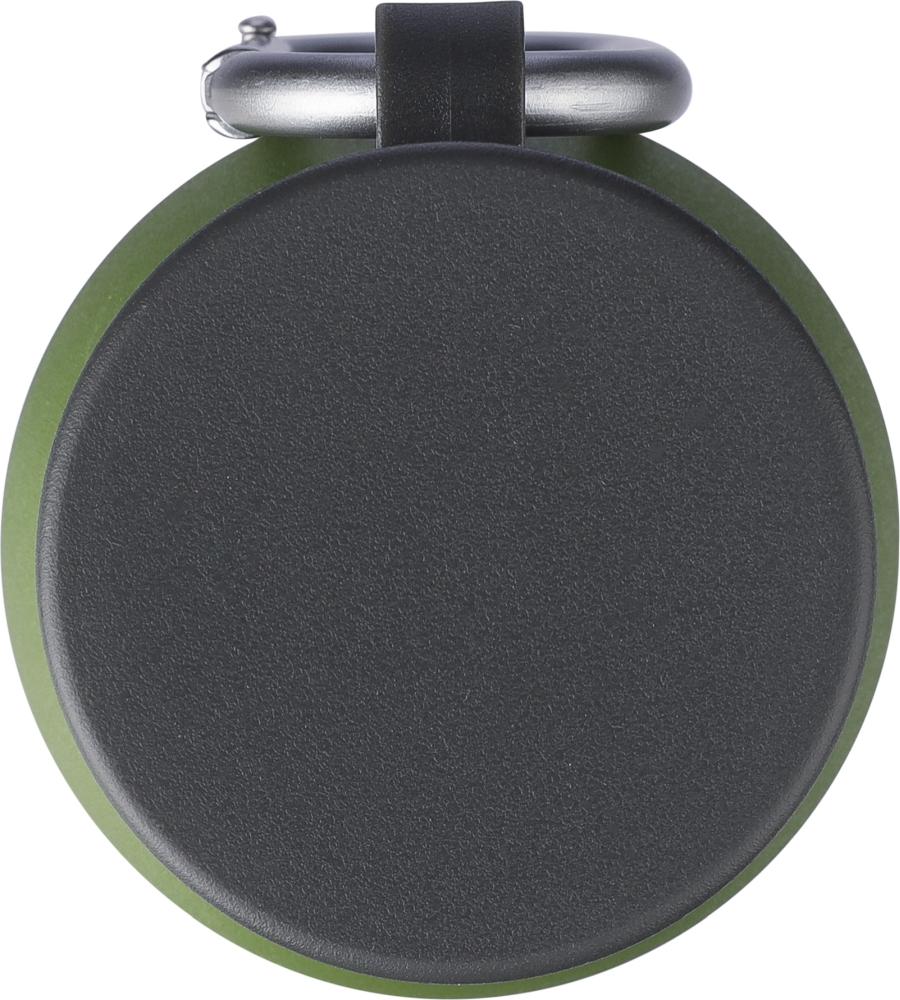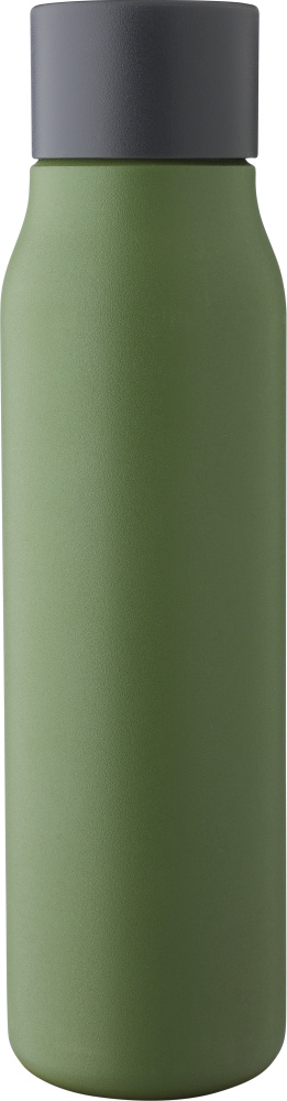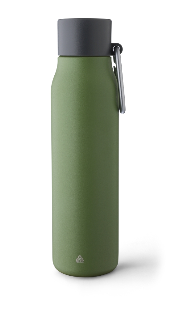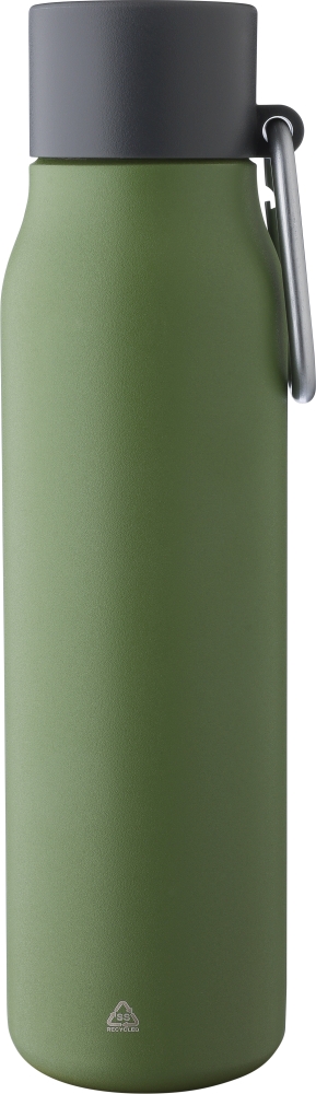 Recycled stainless steel drinking bottle (600 ml). The interior is made of stainless steel 304, and the exterior is stainless steel 201. Features a leak-proof black PP lid with an aluminum carabiner hook and carrying loop. Carabiner hook is not suitable for climbing. Keeps beverages hot for 6 hours or cold for 9 hours. Includes an engraved recycled logo on the front. Individually packaged in a brown cardboard box. Dimensions: 6,5 x 6,5 x 25 cm