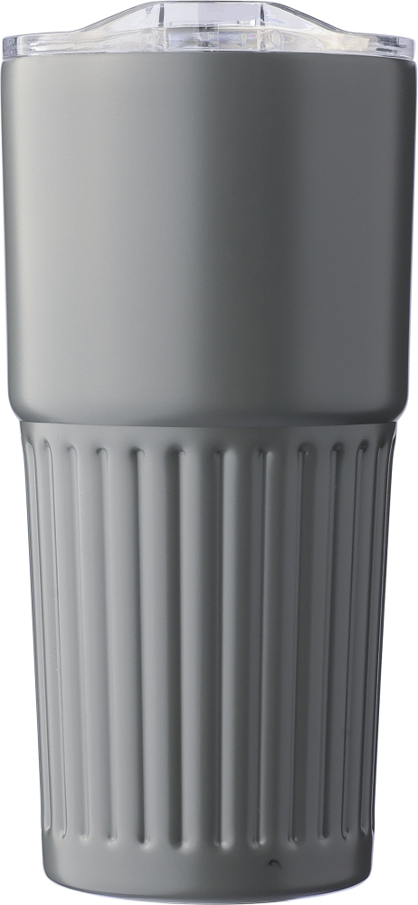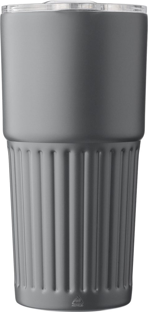 Recycled stainless steel drinking mug (500 ml). The interior is made of stainless steel 304 and the exterior is stainless steel 201 with a ridge grip design. Features an AS lid with a slide closure. Includes an engraved recycled logo on the body. Individually packaged in a brown cardboard box. Dimensions: 8,7 x 18,2 cm