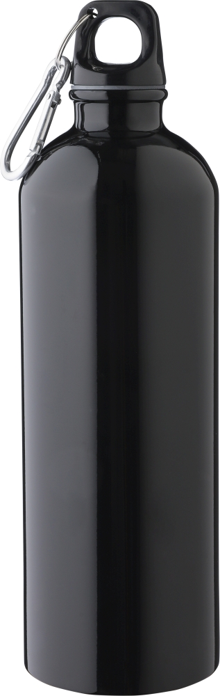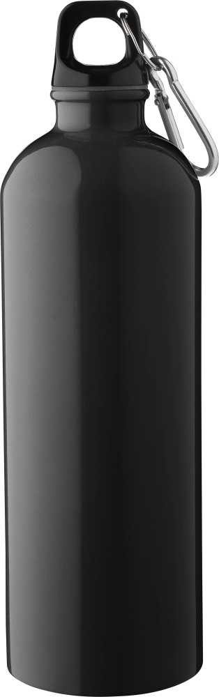 Recycled stainless steel single-walled bottle with a 750 ml capacity, PP lid, and silver aluminum carabiner. Features a recycled engraved logo on the front. Not dishwasher safe. High: 25,5 cm
