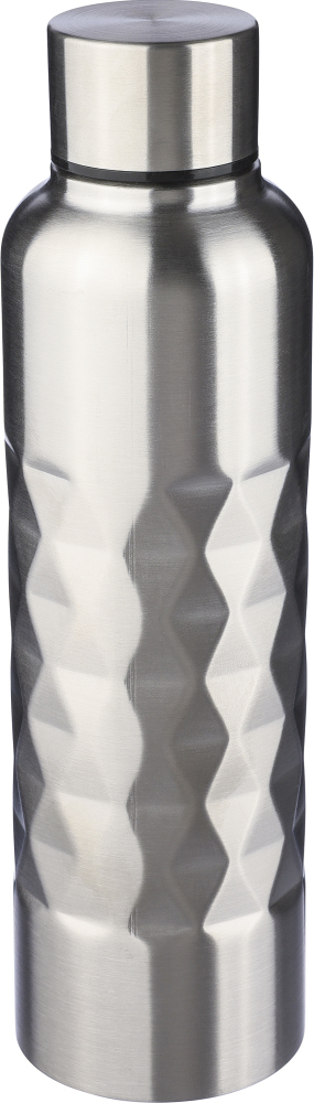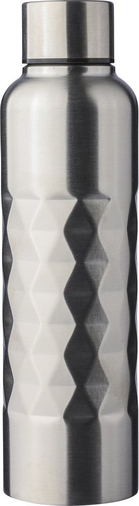 Recycled stainless steel single-walled drinking bottle (800 ml) made from stainless steel 304. Features a diamond-shaped texture on the body, screw lid, and a laser-engraved recycled logo. Individually packaged in a brown cardboard box. Dimensions: 7 x 7 x 25 cm