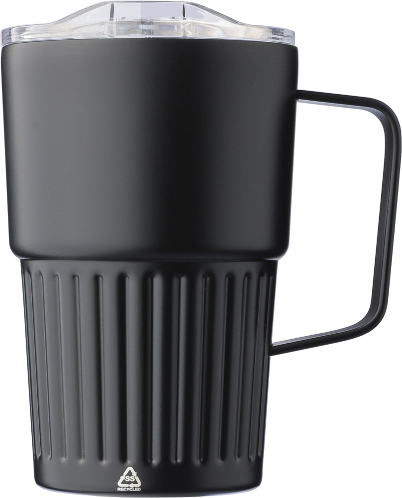 Recycled stainless steel drinking mug (450 ml). The interior is made of stainless steel 304 and the exterior is stainless steel 201 with a ridge grip and sturdy handle. Features an AS lid with a slide closure. Includes an engraved recycled logo on the body. Individually packaged in a brown cardboard box. Dimensions: 8,7 x 14 cm