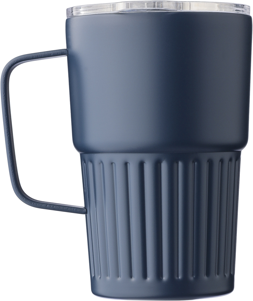 Recycled stainless steel drinking mug (450 ml). The interior is made of stainless steel 304 and the exterior is stainless steel 201 with a ridge grip and sturdy handle. Features an AS lid with a slide closure. Includes an engraved recycled logo on the body. Individually packaged in a brown cardboard box. Dimensions: 8,7 x 14 cm