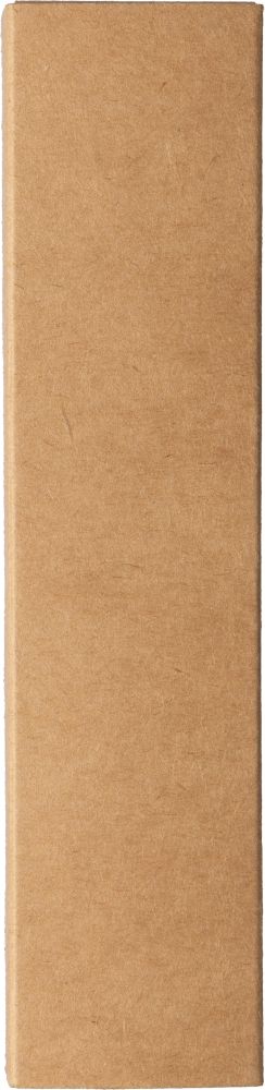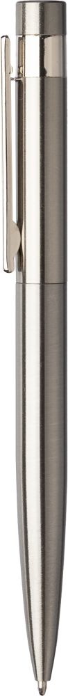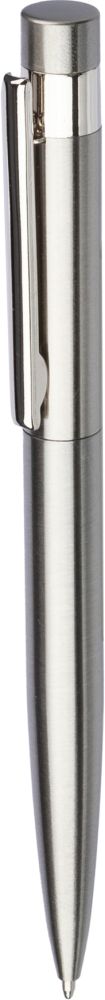 Recycled stainless steel twist ballpen, including a recycled stainless steel logo on the backside, with blue ink. Individually packaged in a kraft paper gift box.