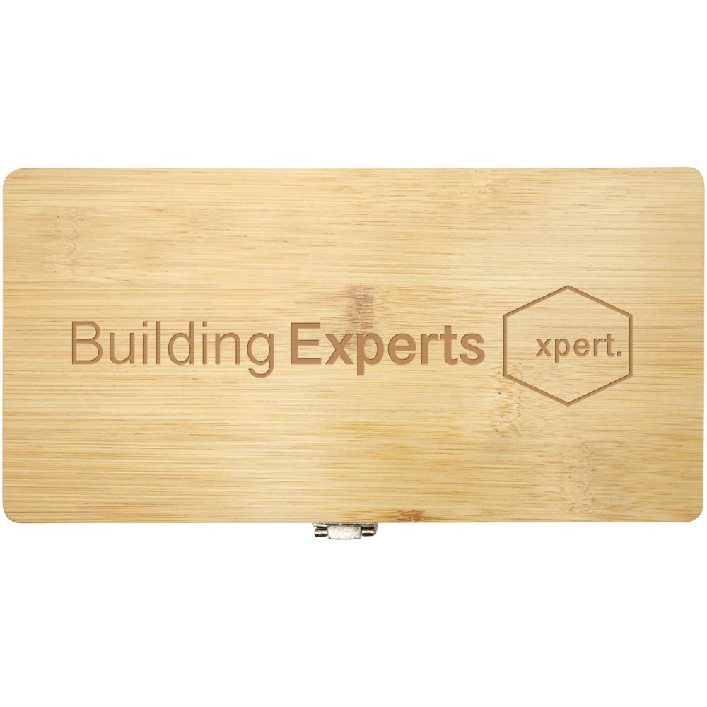 Experience the perfect blend of sustainability and functionality with the Rivet tool set. This meticulously designed toolbox is not only visually appealing, but also environmentally responsible without compromising on quality or performance. The bamboos natural strength and durability ensure that your tools are protected for years to come. Inside the case, youll find a set of 19 essential tools crafted from carbon steel and recycled plastic: 1 long joint handle, 4 high-quality sockets for various applications, 1 extension bar for hard-to-reach areas, 10 precision engineered screwdriver bits for any task, and 3 hex keys for furniture assembly. Whether youre a DIY enthusiast or a professional tradesperson, these tools are designed to perform reliably and withstand rigorous use. Since bamboo is a natural product, there may be slight variations in colour and size per item, which may affect the final printing outcome. Packed in a STAC gift box from sustainable sources.