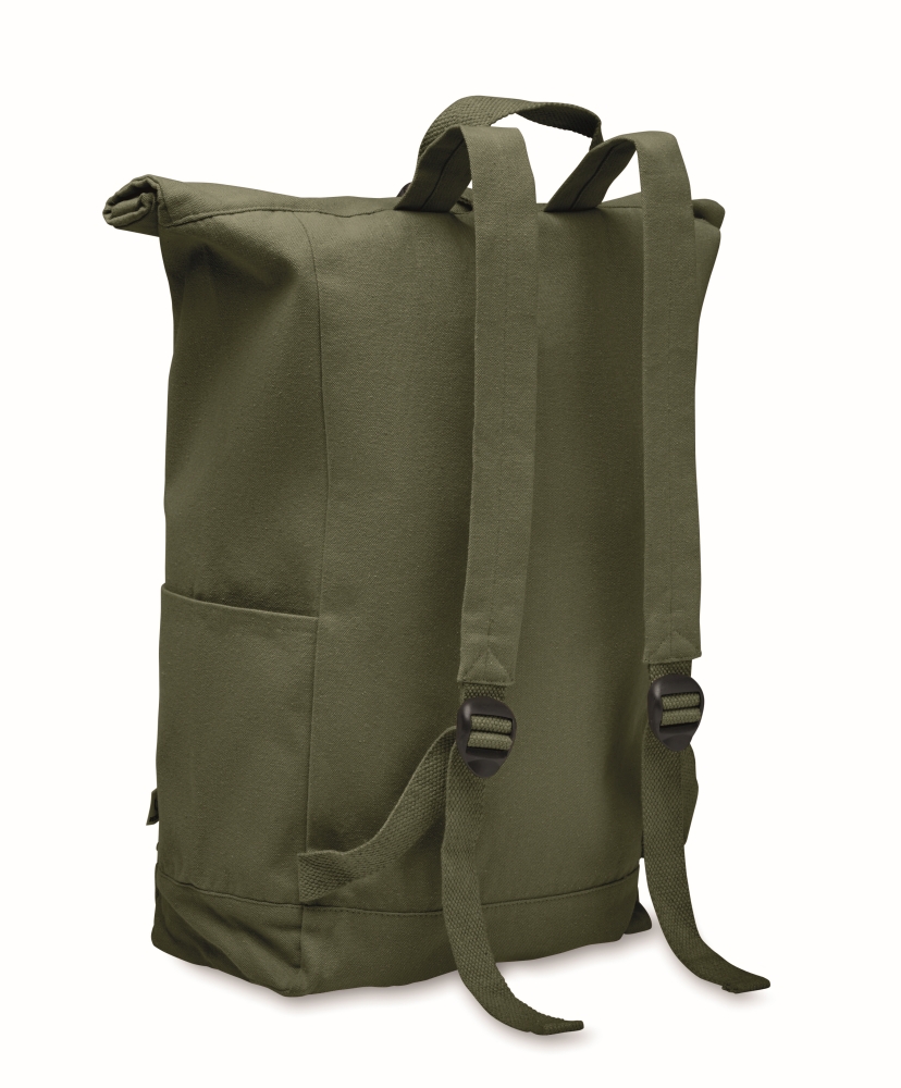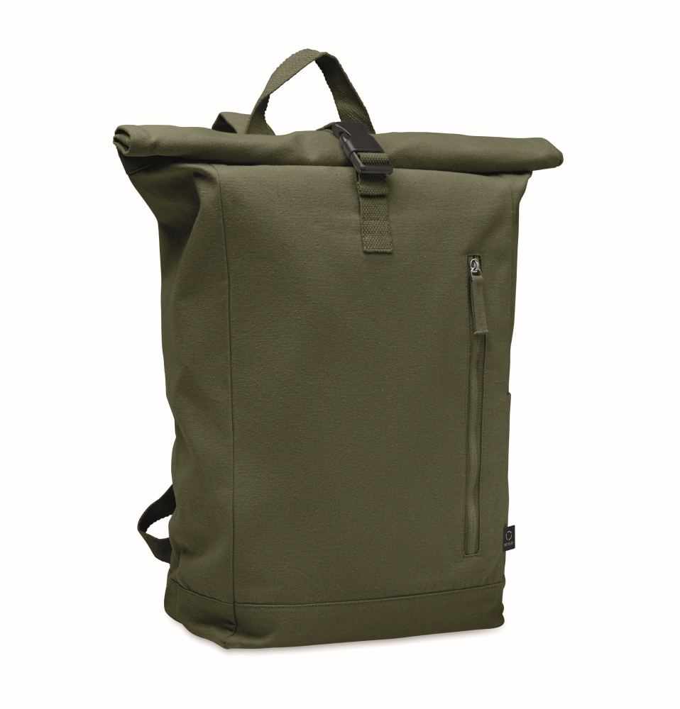 Roll top backpack with hook and loop closure in 390 gr/m2 recycled cotton (80%) and recycled polyester (20%). Zippered front pocket. Dimensions: 26 x 14 x 56 cm