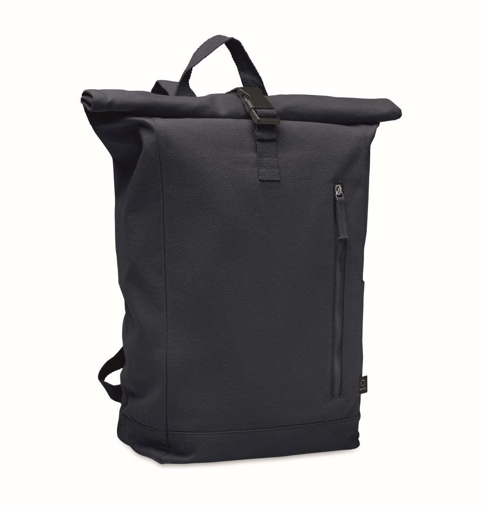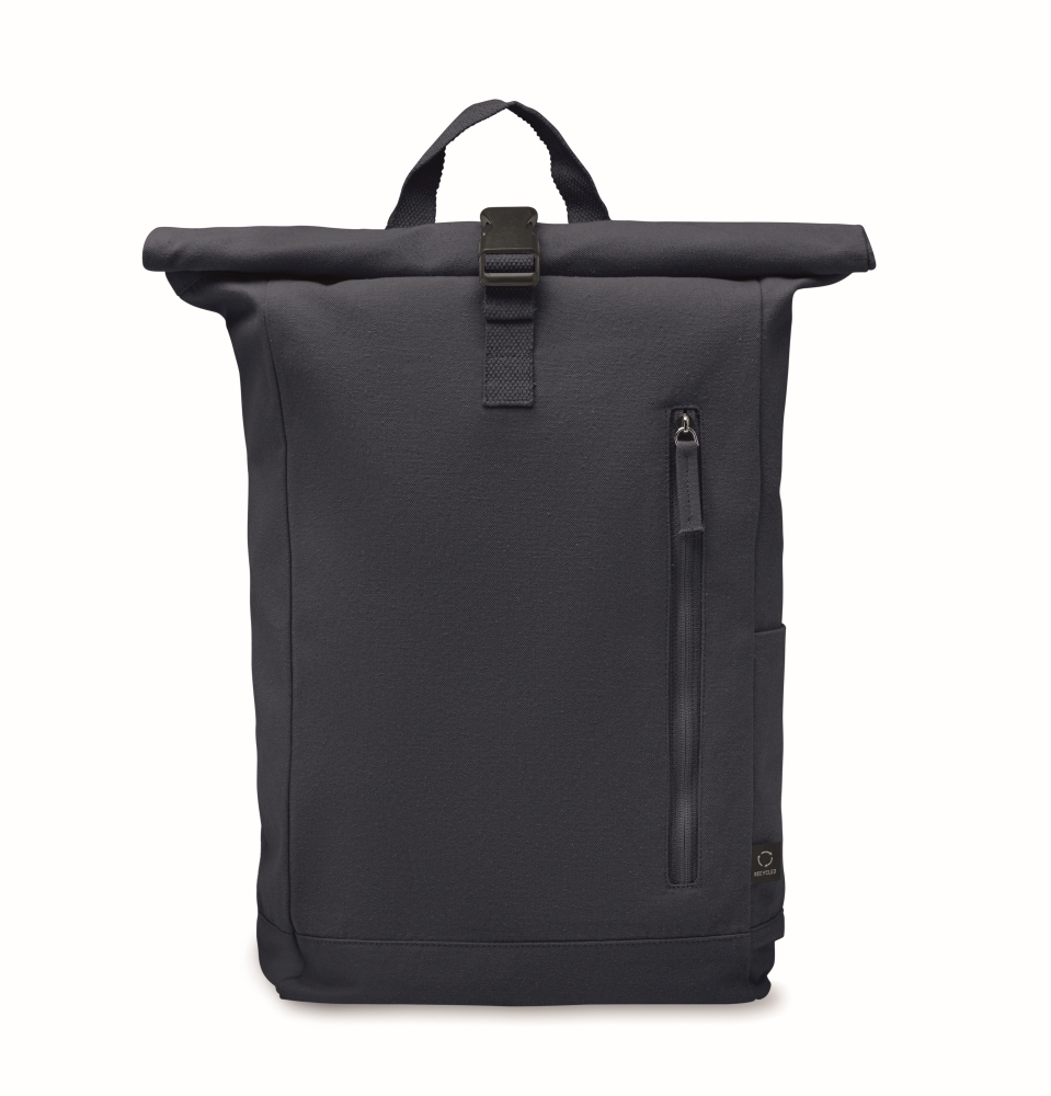 Roll top backpack with hook and loop closure in 390 gr/m2 recycled cotton (80%) and recycled polyester (20%). Zippered front pocket. Dimensions: 26 x 14 x 56 cm