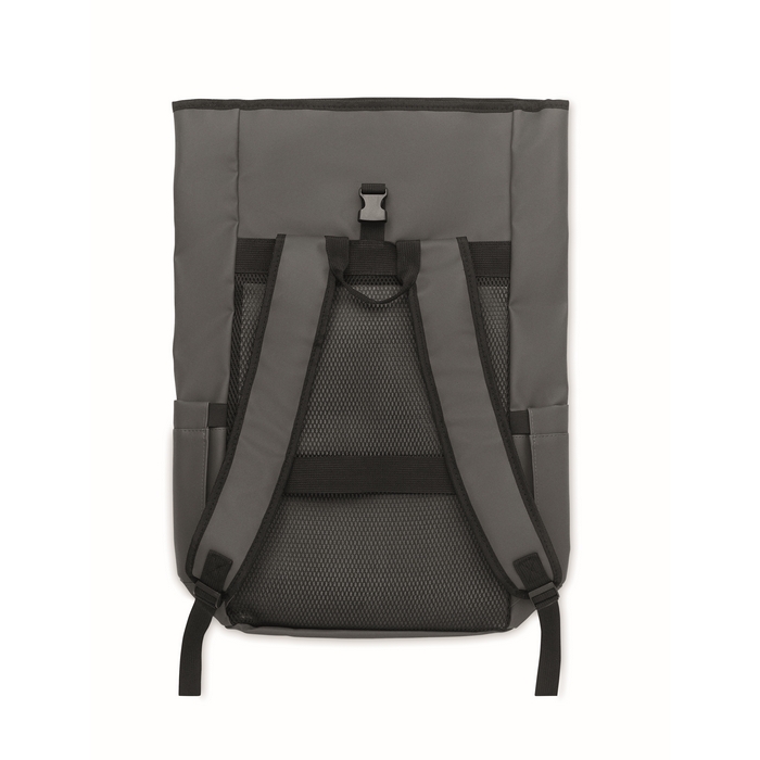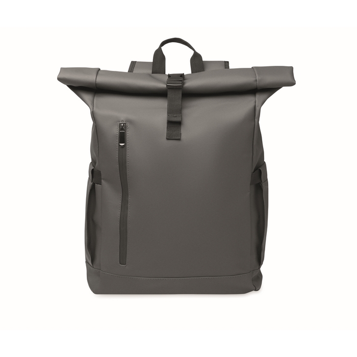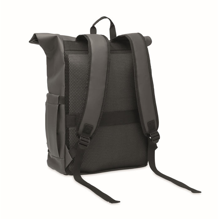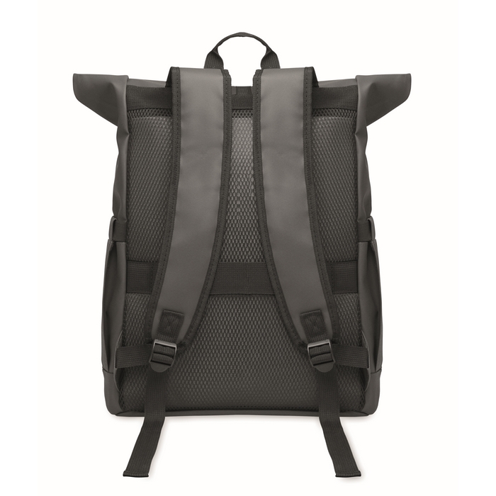 Roll top 15 inch laptop backpack in PU coated 600D RPET polyester and RPET polyester lining. Meshed padded back with zippered pocket and trolley strap. Padded shoulder strap with mesh inside finishing.Dimensions: 30 x 25 x 57cm
