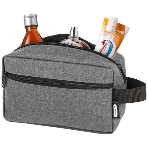 The Ross toiletry bag is the perfect travel companion for cosmetics and hygiene articles. It is manufactured with GRS certified recycled polyester, making it a more sustainable choice. Featuring a zipped main compartment, a front pocket, and a webbing loop. Capacity: 1.5 litres.