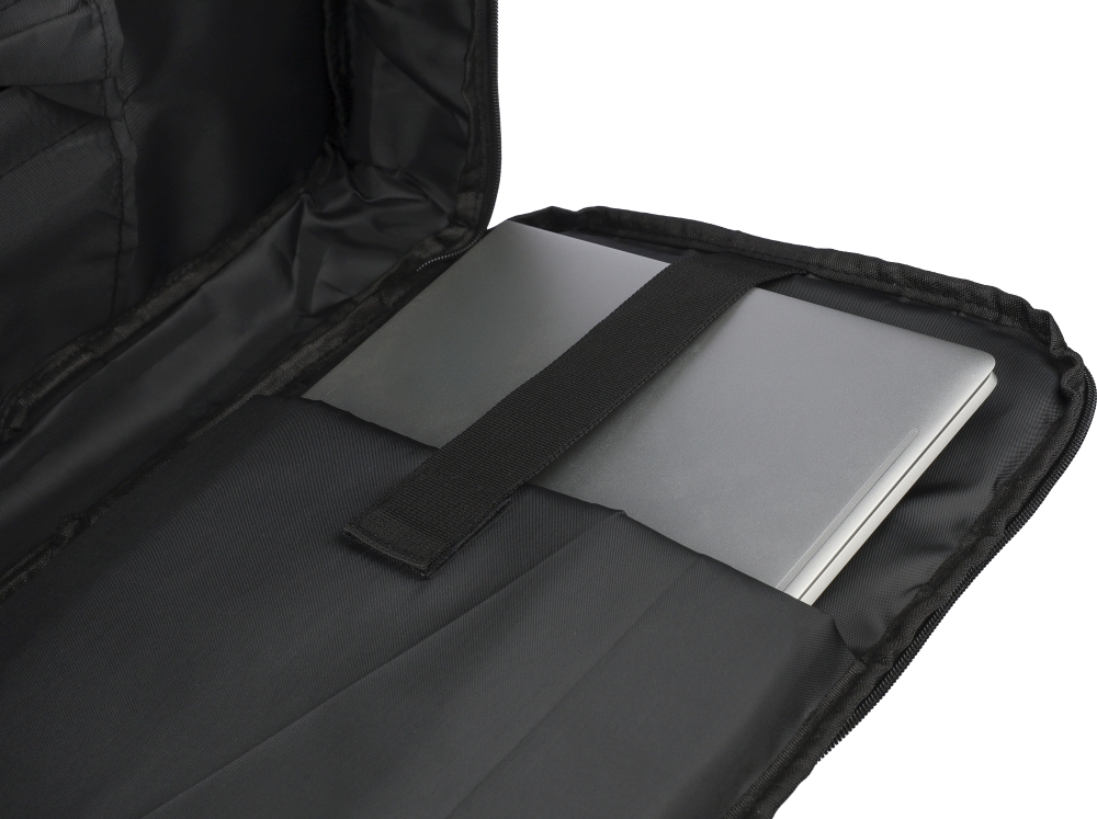 rPET polyester 300D laptop backpack with a 210D rPET lining. Features a large zippered compartment with multiple insert pockets, a Velcro-closure laptop pocket for 15-inch laptop, and a 12L capacity. The design includes a reinforced, ventilated backing, adjustable shoulder straps, a side carrying handle, and a trolley strap. Carrying capacity: 10 kg. Dimensions: 30 x 11 x 42 cm