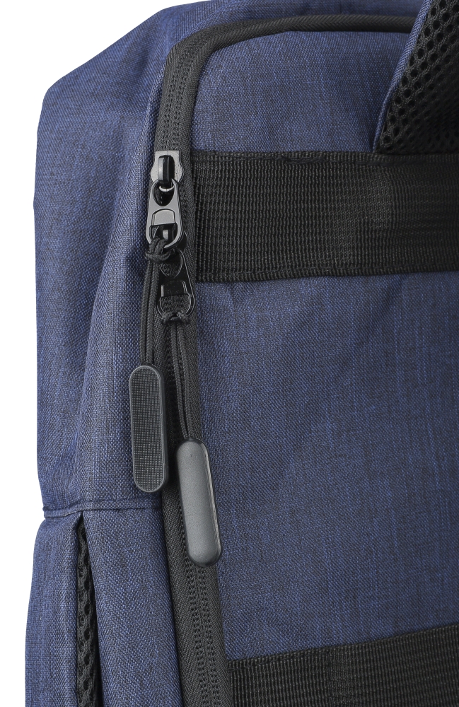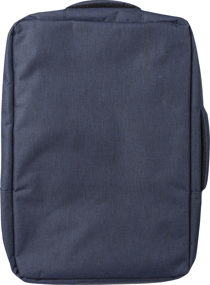 rPET polyester 300D laptop backpack with a 210D rPET lining. Features a large zippered compartment with multiple insert pockets, a Velcro-closure laptop pocket for 15-inch laptop, and a 12L capacity. The design includes a reinforced, ventilated backing, adjustable shoulder straps, a side carrying handle, and a trolley strap. Carrying capacity: 10 kg. Dimensions: 30 x 11 x 42 cm