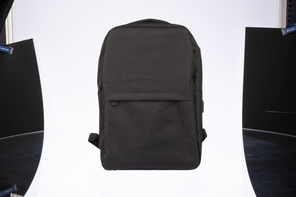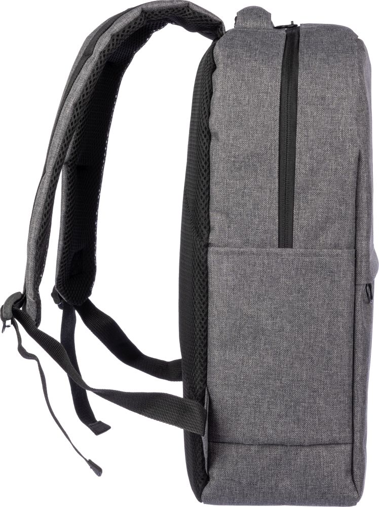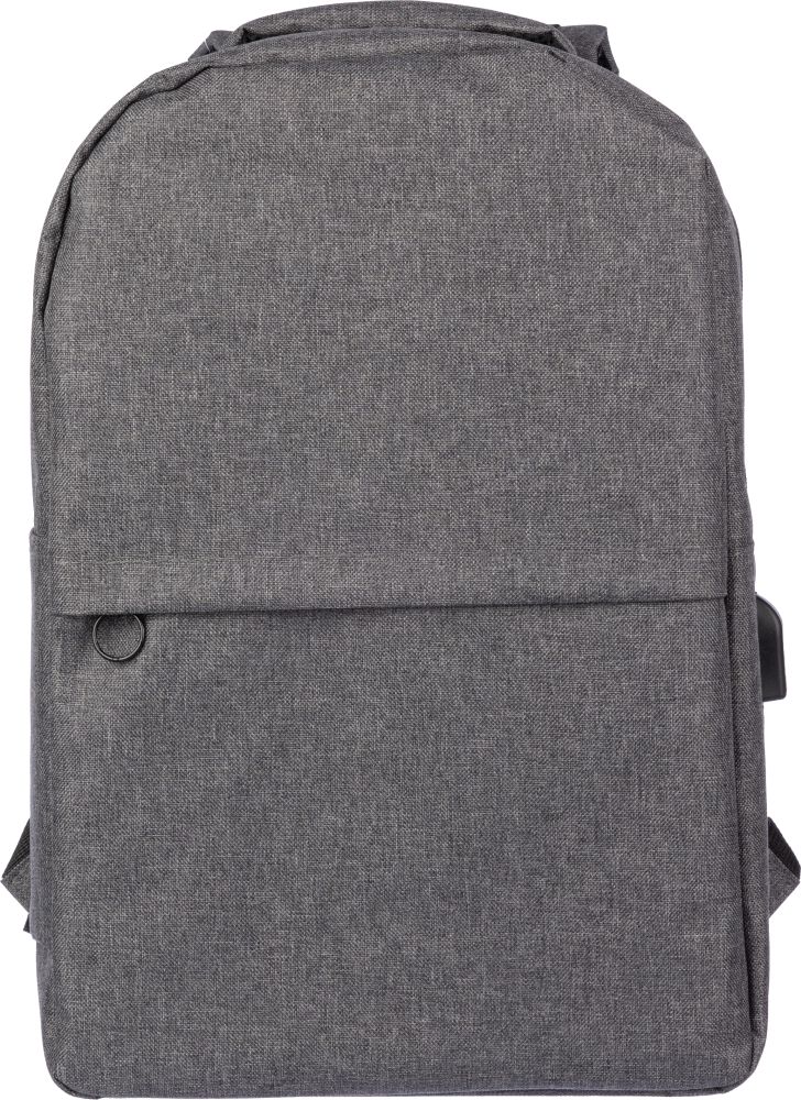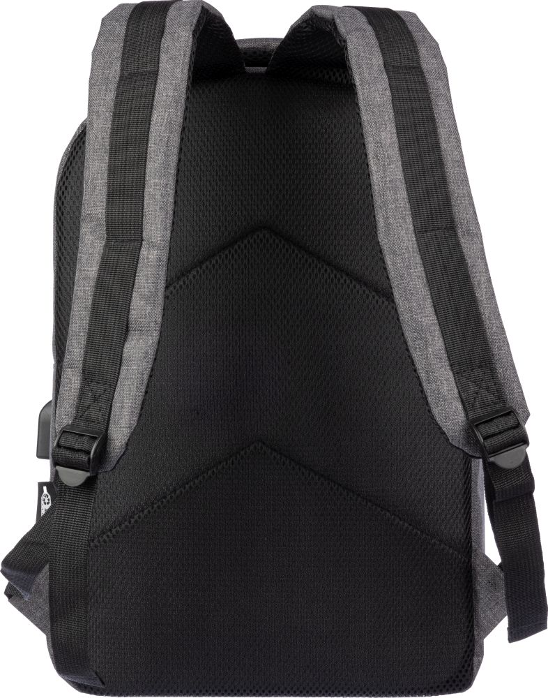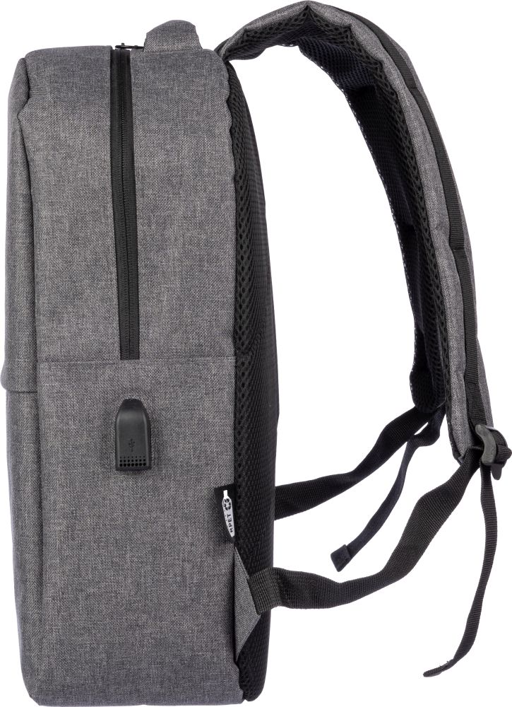 rPET (600D) backpack with USB port opening (and USB cable inside) with a large zippered compartment on the topside and a zippered pocket on the front side. Inside, there is a compartment for 10-inch devices and one for 15-inch devices. With adjustable handles.