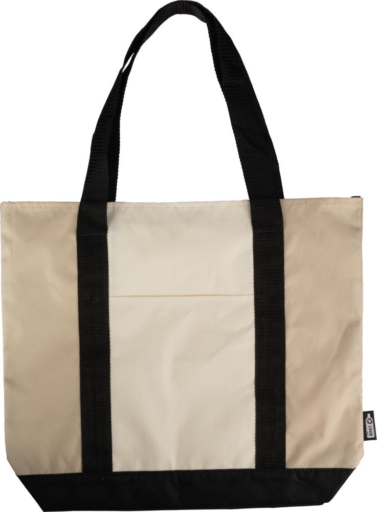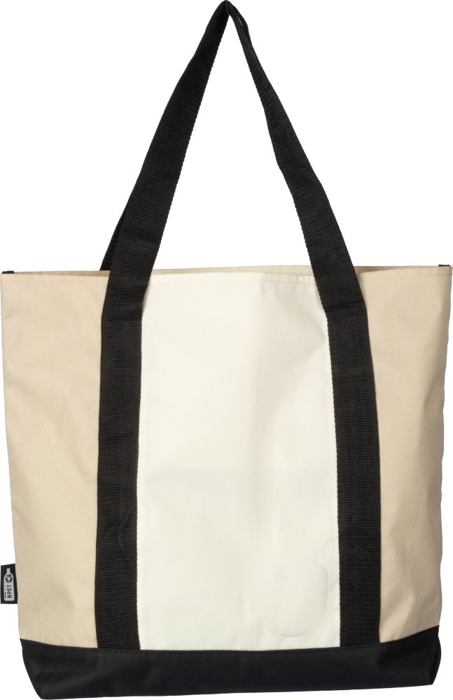 rPET (600D) tote bag with a large zippered compartment on the topside and an open pocket on the front side. With long handles.
