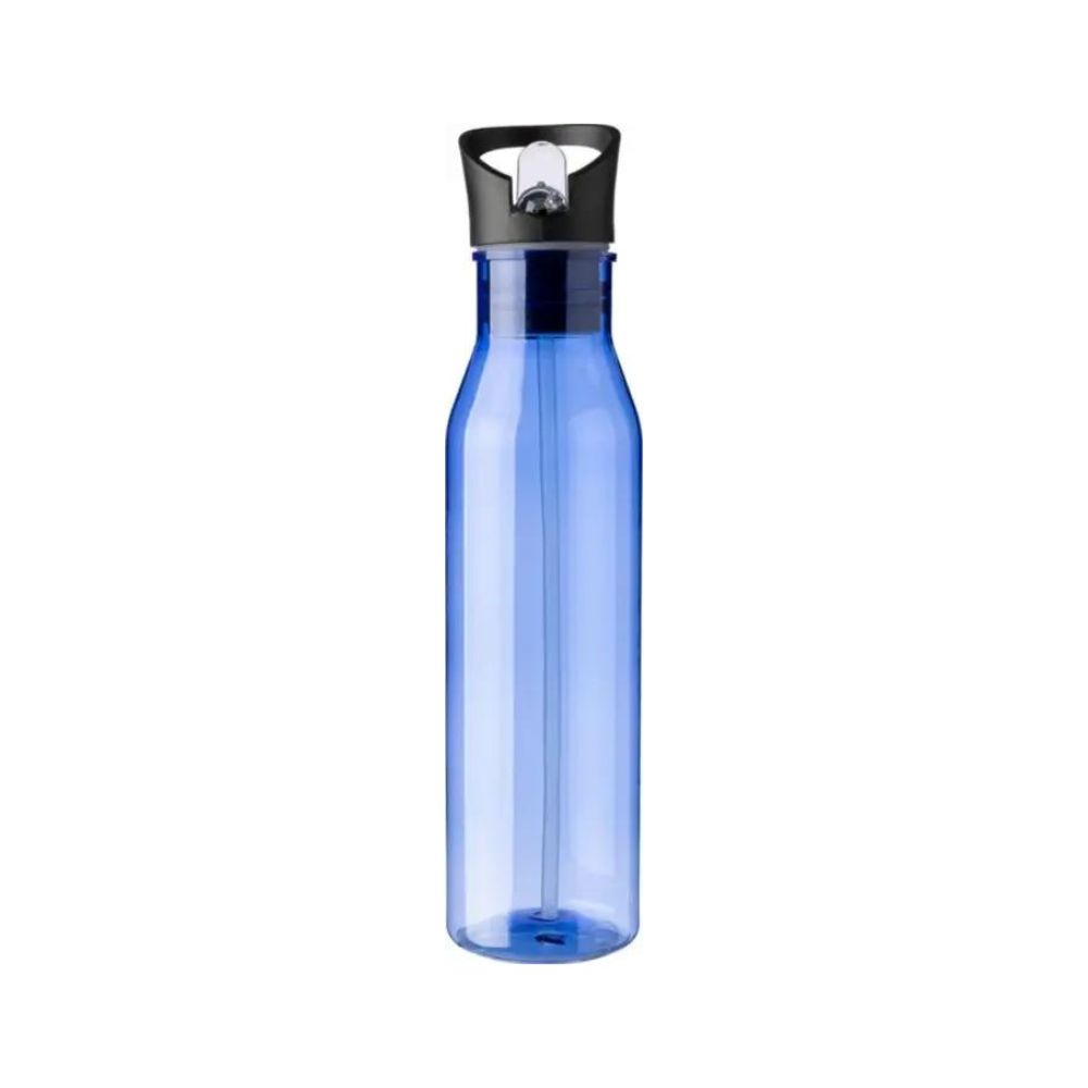 rPET drinking bottle (730 ml) with foldable spout and straw inside. Carrying loop on the topside of the PP lid. Packaged in bulk with tissue paper.