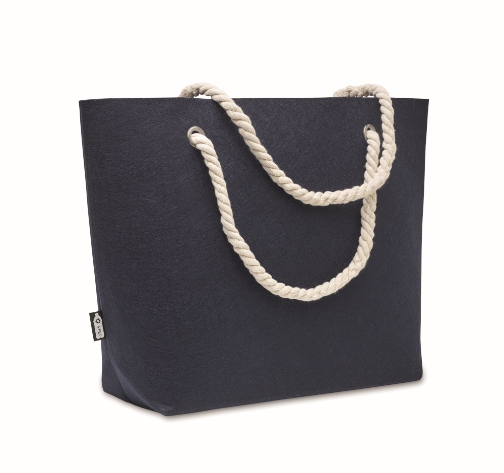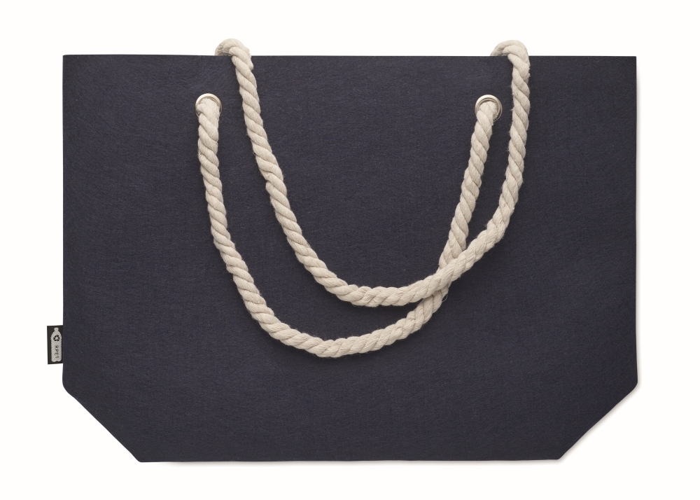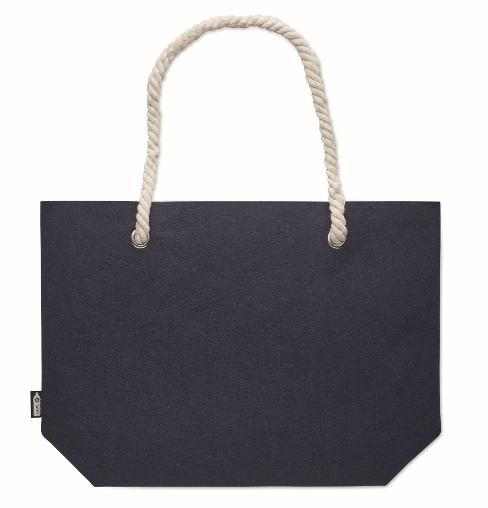 RPET felt beach bag or shopping bag with cord handle. Felt thickness: 2 mm. Dimensions: 46 x 13 x 32 cm